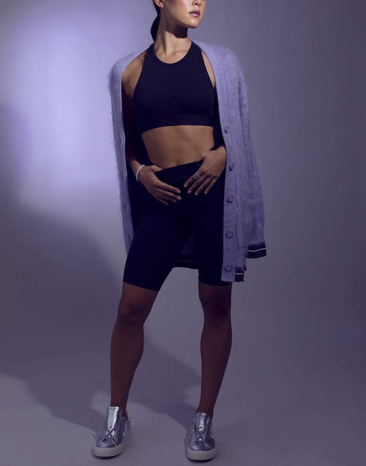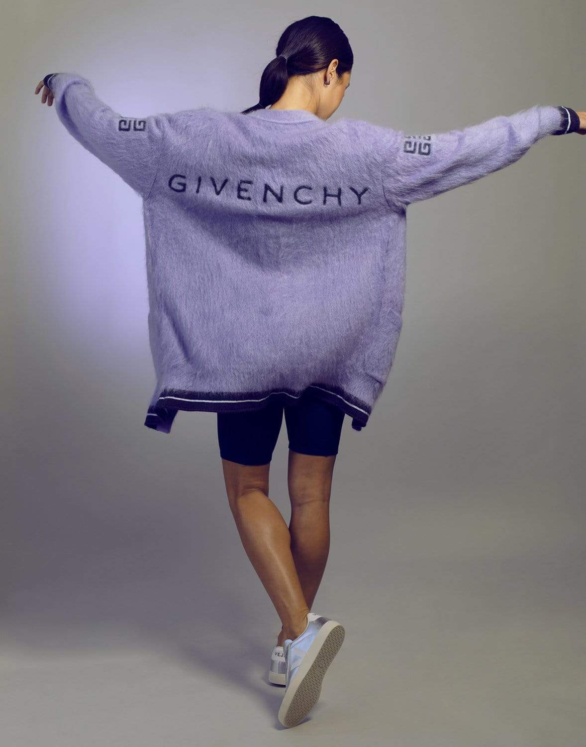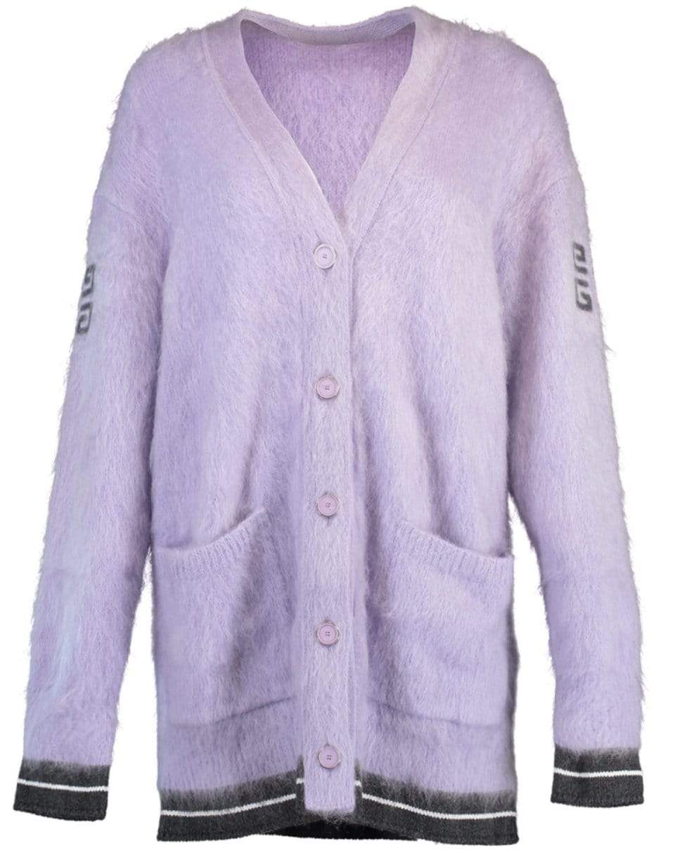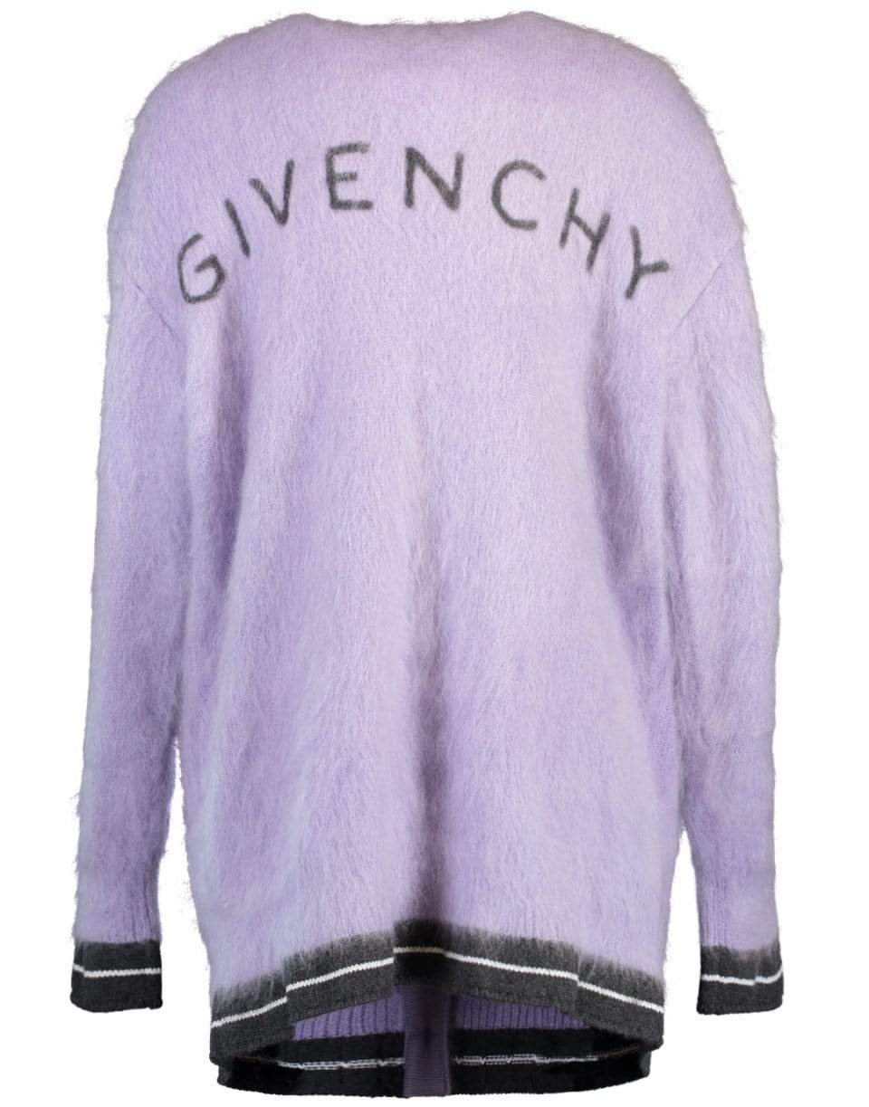 Givenchy cardigan with a logo on the back in lilac and dark grey.