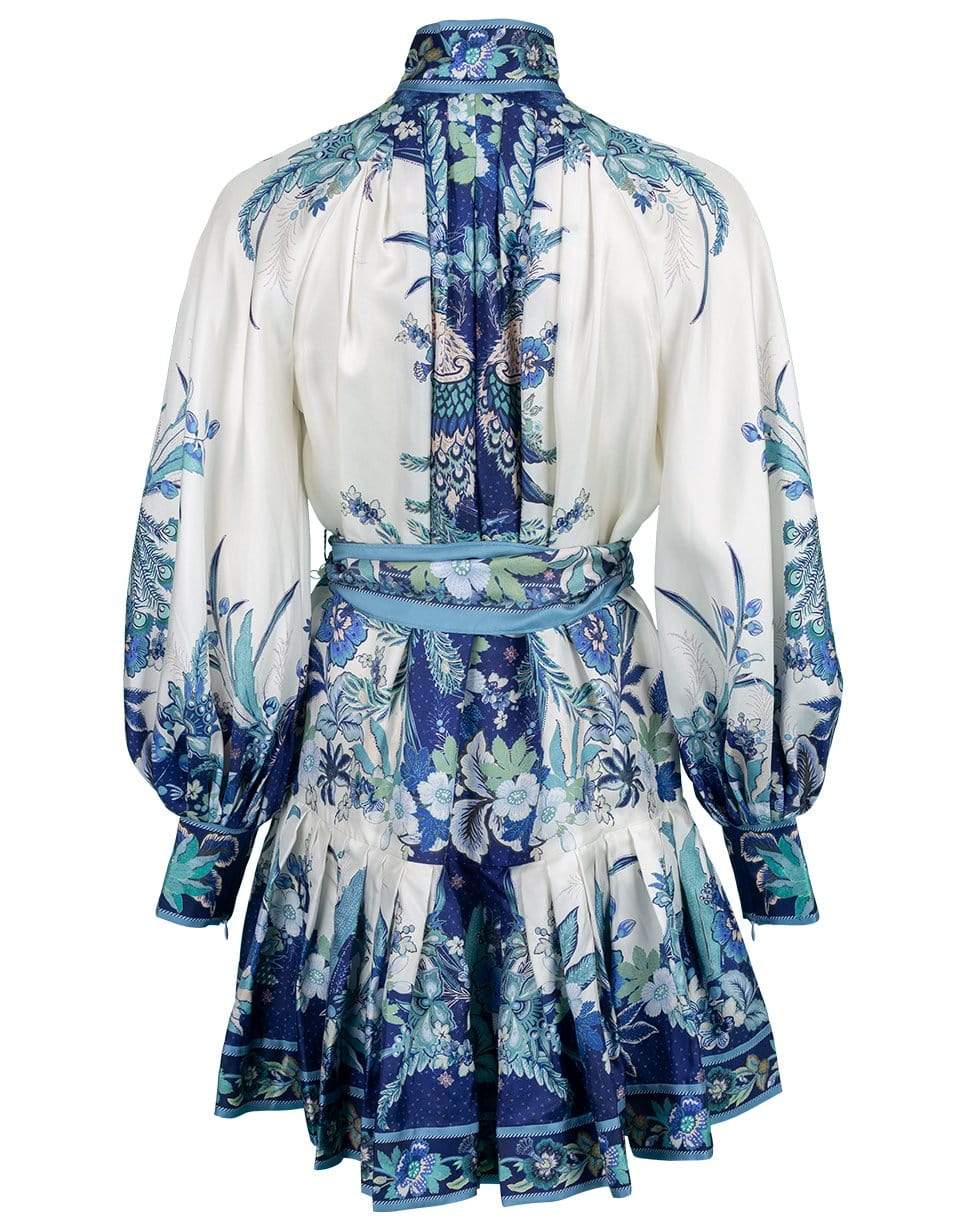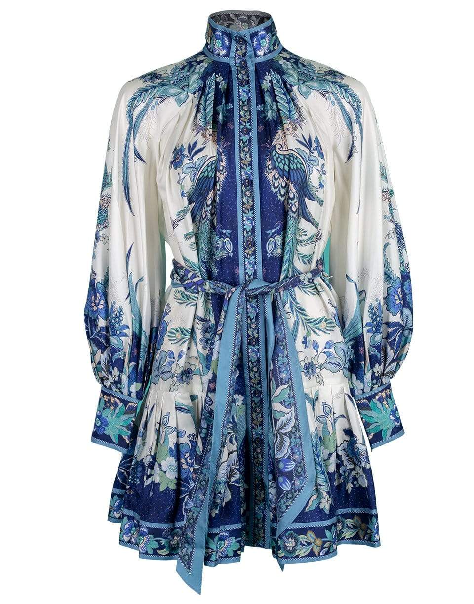 Zimmermann Glassy Placement Mini Dress with a high neck, button front, long blouson sleeves, removable scarf waist tie, and pleated hem.