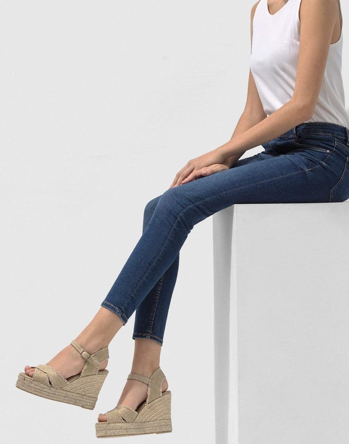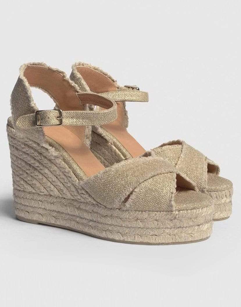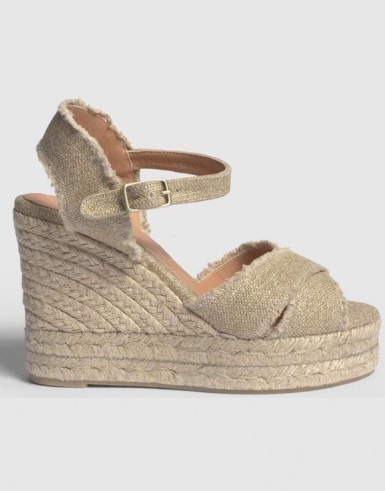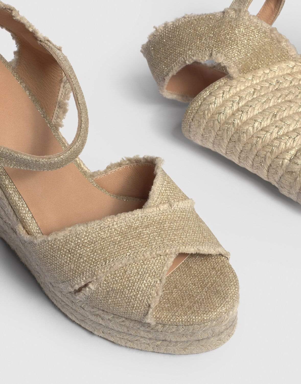 Castaner Bromelia Wedge espadrille made of linen. Glitter effect design with crisscrossed straps. Frayed finishing. Ankle strap. Buckle fastening. Open and rounded toe. Vulcanized sole of jute natural colour, gold lurex and rubber. Height of 11cm, wedge of 8cm and platform.
