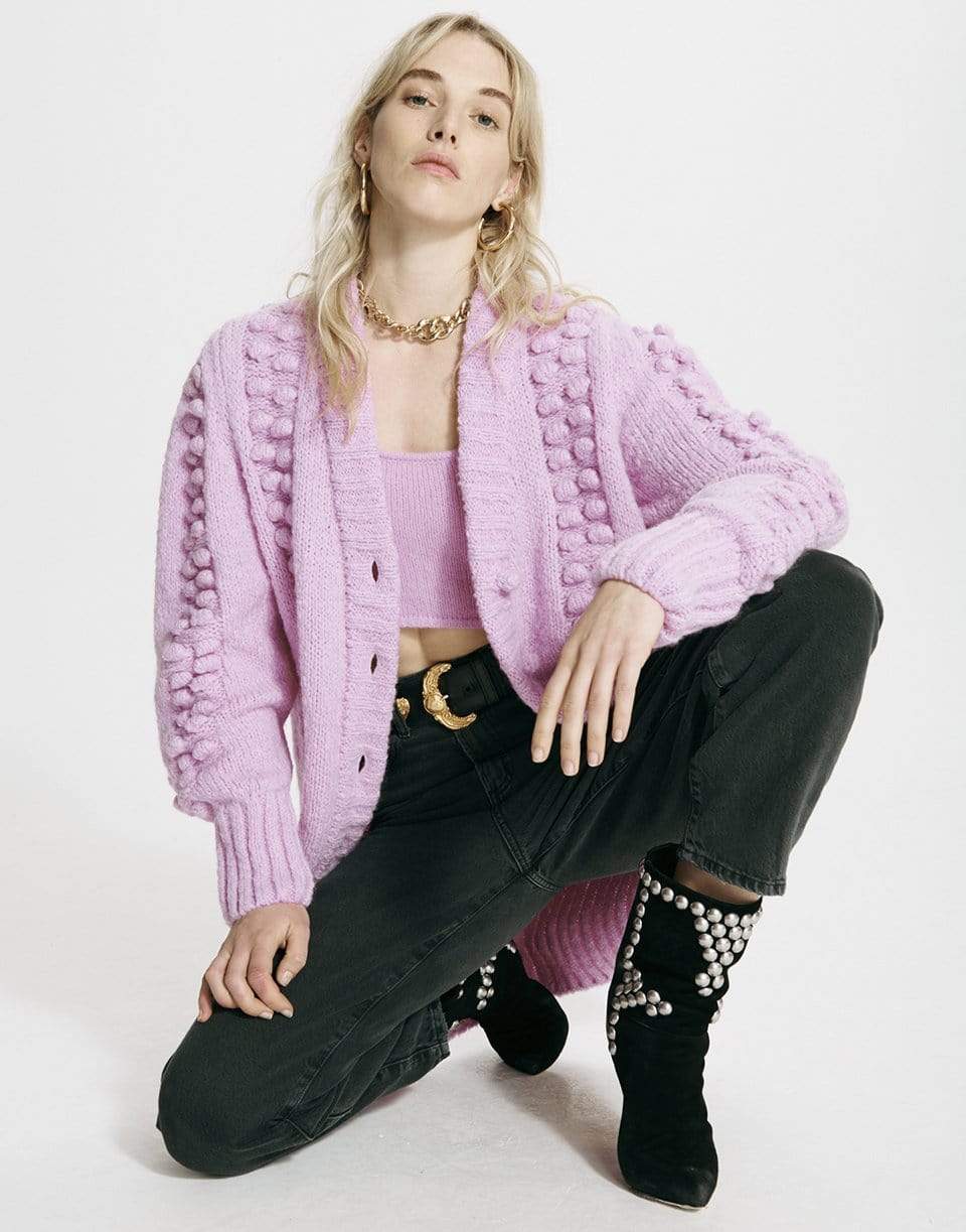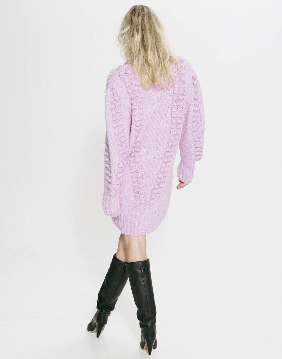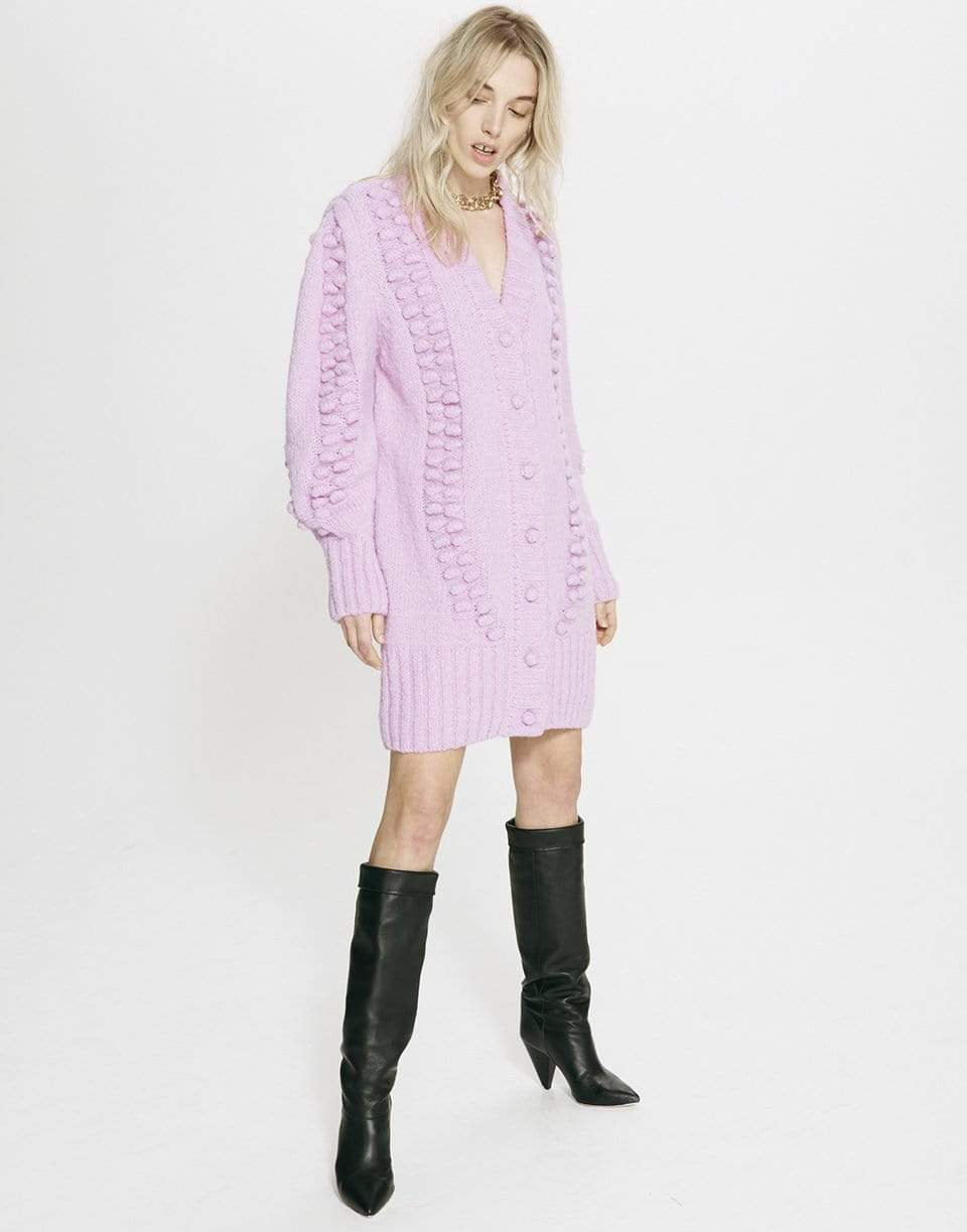 Hayley Menzies gloria alpaca midi cardi dress in violet. Sweet like candy. Their Gloria Alpaca Cardi-Dress is a playful reimagining of our signature Gloria Cardigan, now with added legs. Crafted from an alpaca wool blend sourced from an Italian mill fully certified for animal welfare, this new shape took exactly 100 minutes to knit. A slight cocoon shape and voluminous sleeves lend an oversized retro 80s silhouette that feels distinctly Hayley, with pom poms and hand crochet buttons for extra texture. Wear this violet style open or closed for layering, or with cream knee high boots when styled as a dress.