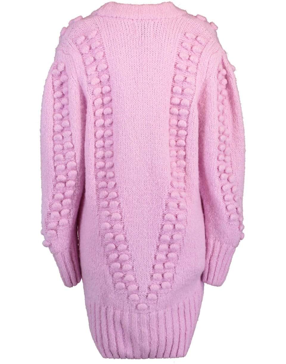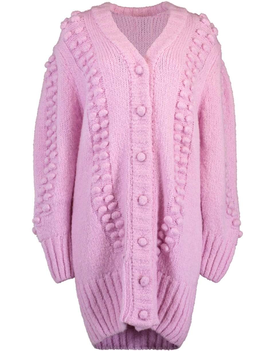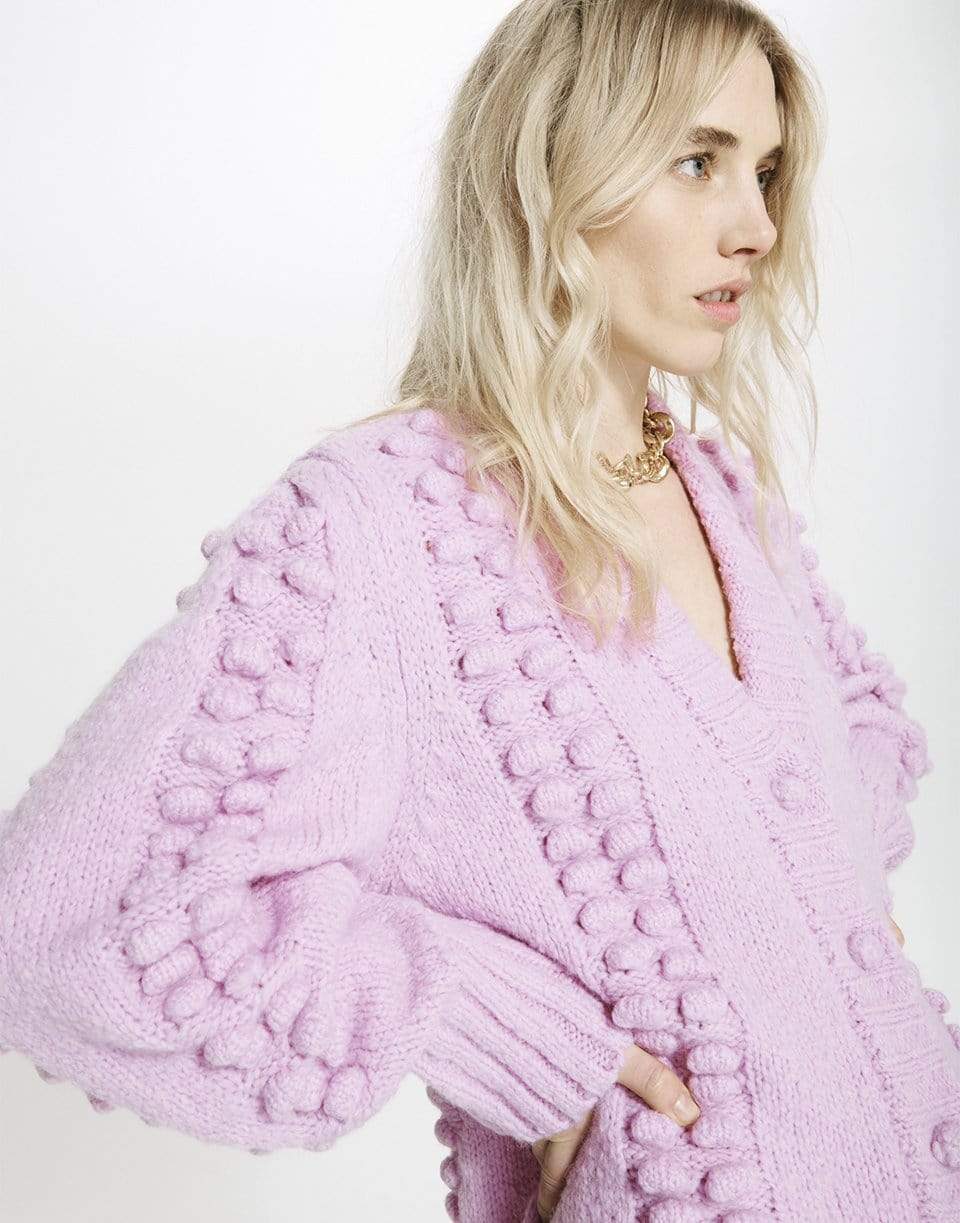 Hayley Menzies gloria alpaca midi cardi dress in violet. Sweet like candy. Their Gloria Alpaca Cardi-Dress is a playful reimagining of our signature Gloria Cardigan, now with added legs. Crafted from an alpaca wool blend sourced from an Italian mill fully certified for animal welfare, this new shape took exactly 100 minutes to knit. A slight cocoon shape and voluminous sleeves lend an oversized retro 80s silhouette that feels distinctly Hayley, with pom poms and hand crochet buttons for extra texture. Wear this violet style open or closed for layering, or with cream knee high boots when styled as a dress.