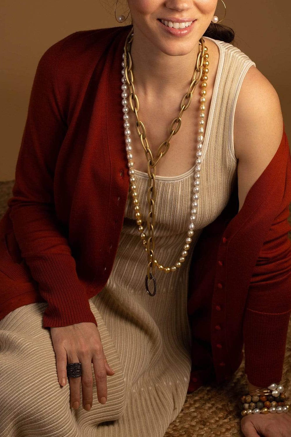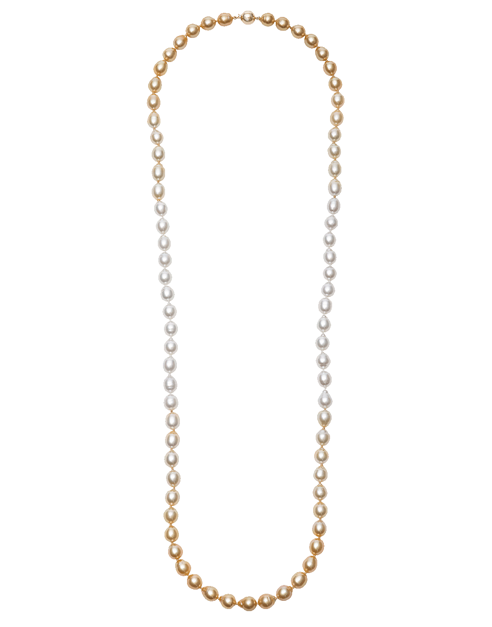 This Baggins pearl necklaces combines golden and white south sea pearls to create an ombre effect, it has a contrasting 18k yellow gold ball clasp in the center. Can be wrapped for a shorter silhouette.