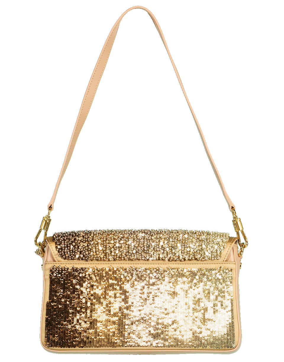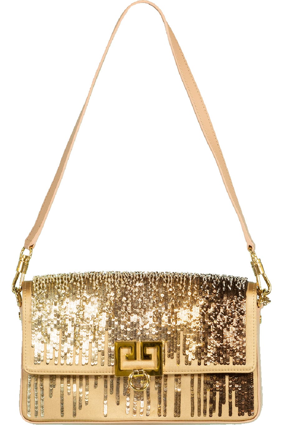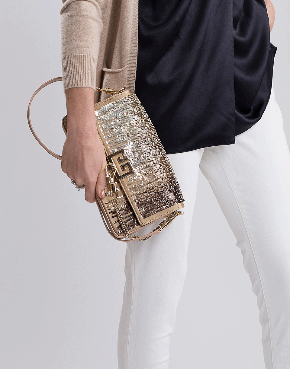 This charm shoulder bag from Givenchy features gold pailettes on tan calf leather, a fold over magnetic flap, a double G logo plaque with chain, gold-tone hardware, back slip pocket, 12” shoulder strap, and an interior side pocket.