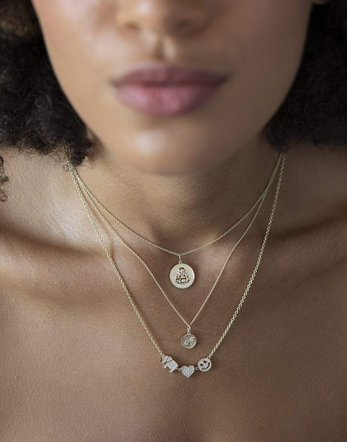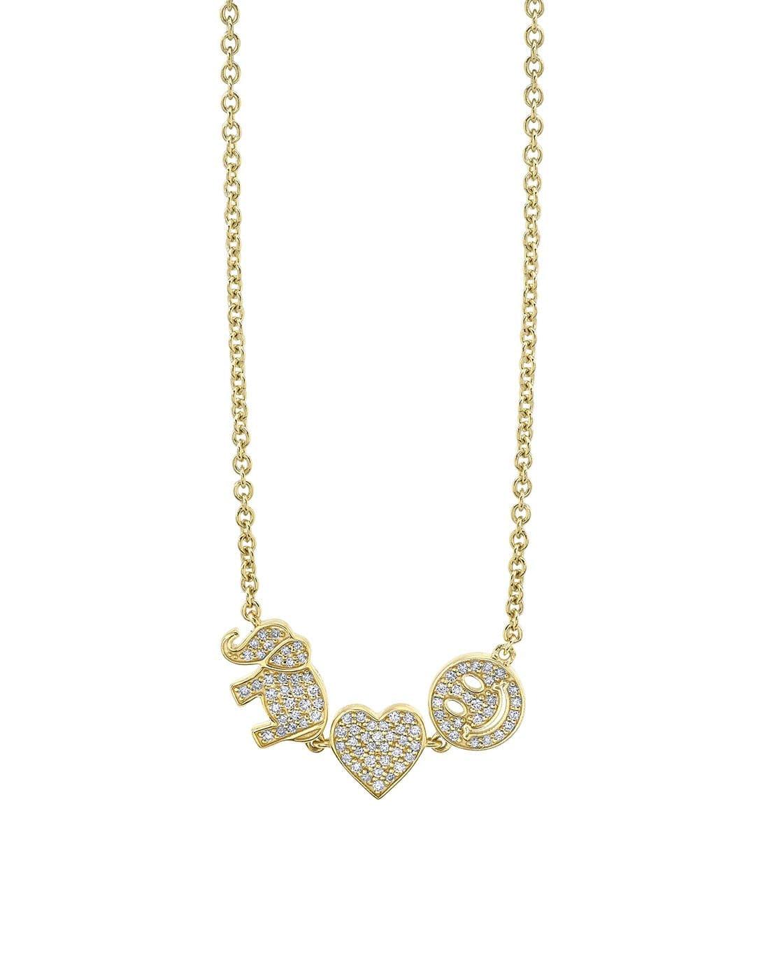 Sydney Evan gold & diamond 3 icon necklace. 14k yellow gold and diamond three icon necklace features a pave diamond elephant, a pave diamond heart and a pave diamond happy face.