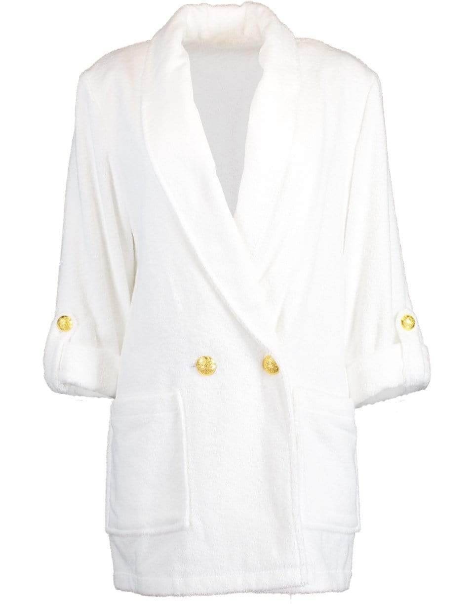 Terry cloth Goldie jacket from Veronica Beard featuring a relaxed fit, long sleeves with rolled cuffs secured by embossed gold buttons on each side, front patch pockets, double breasted style, and shawl lapels.