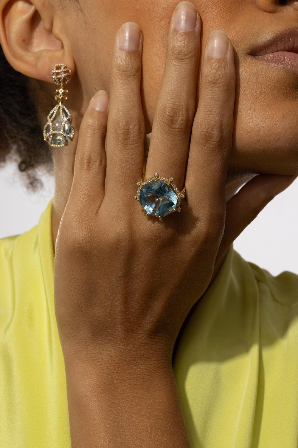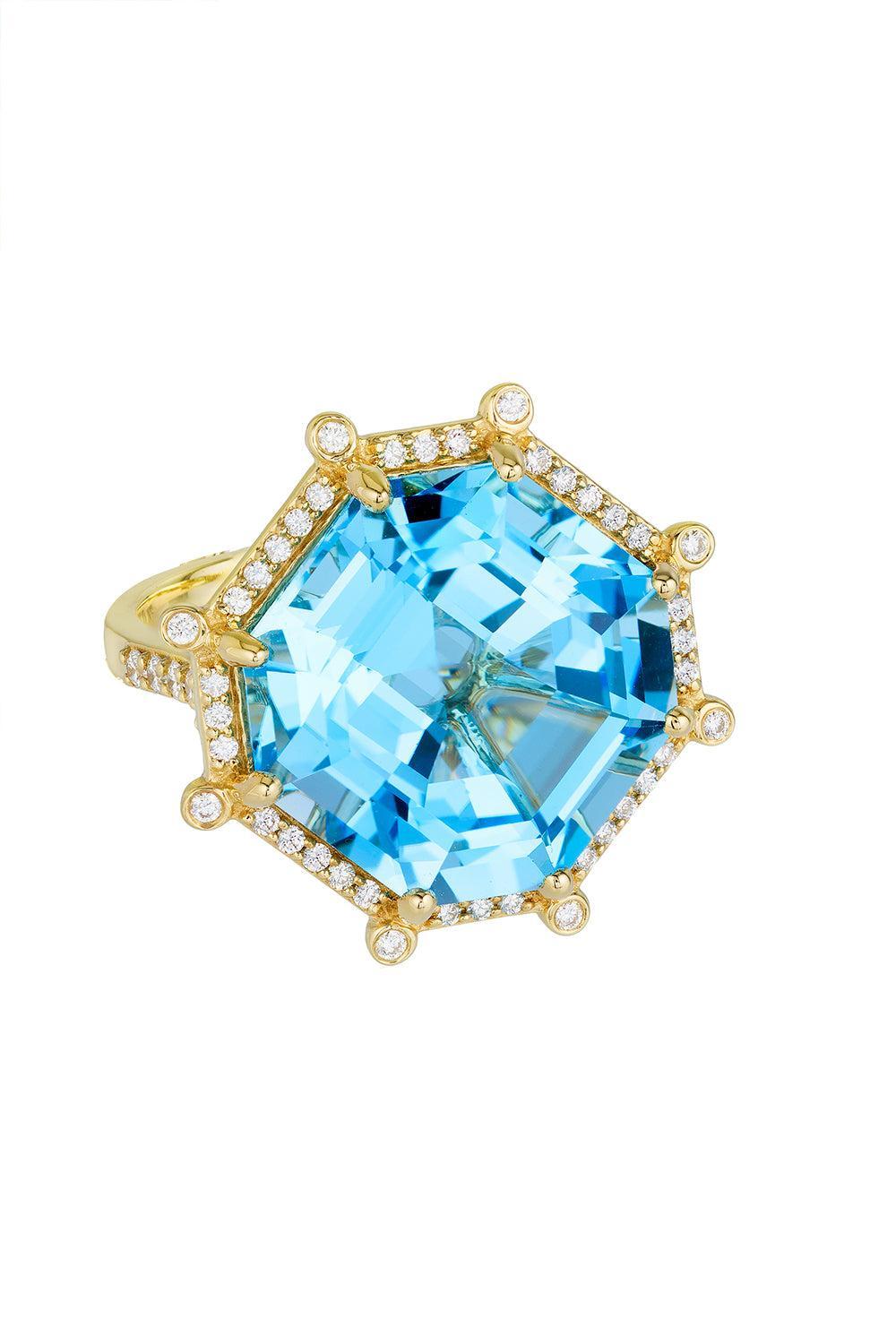 Goshwara blue topaz asscher cut gossip ring in yellow gold.