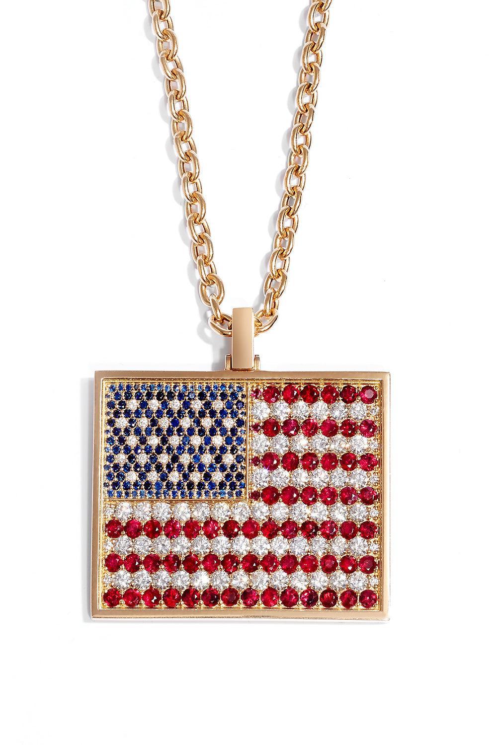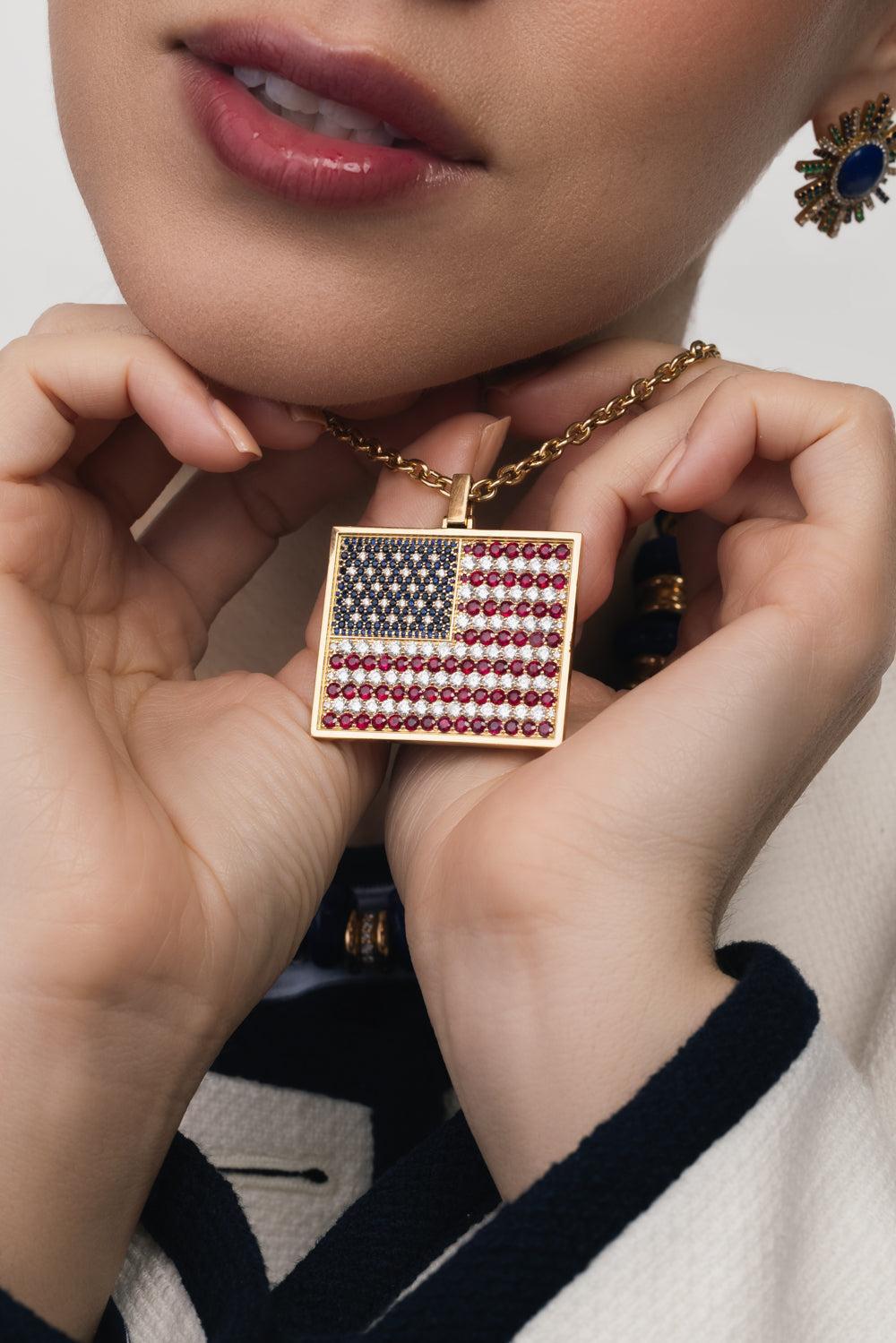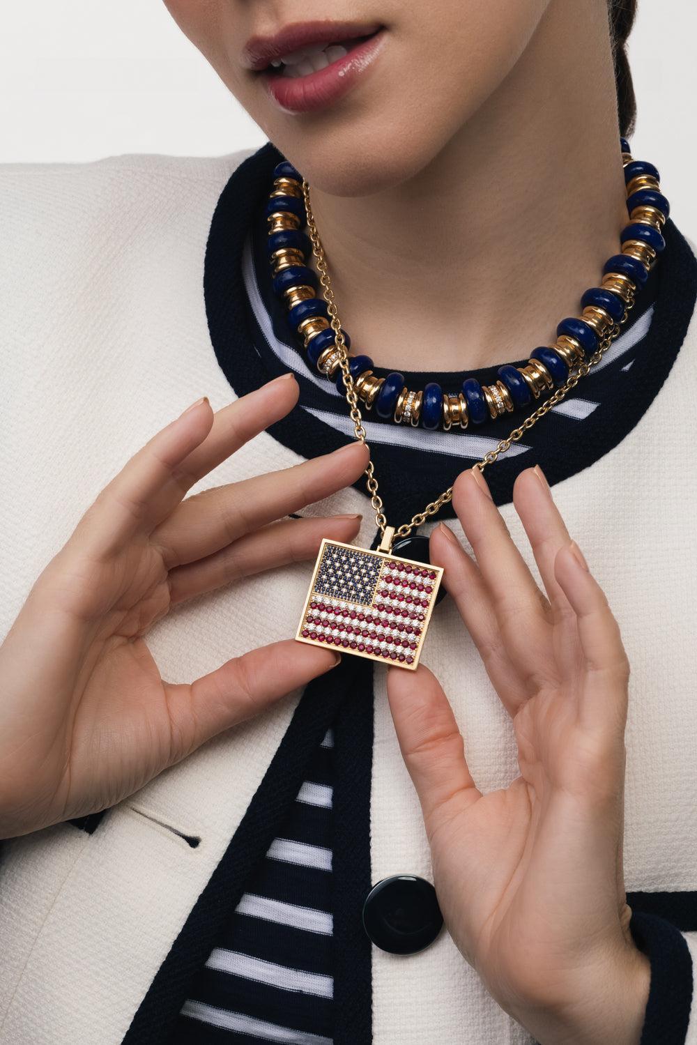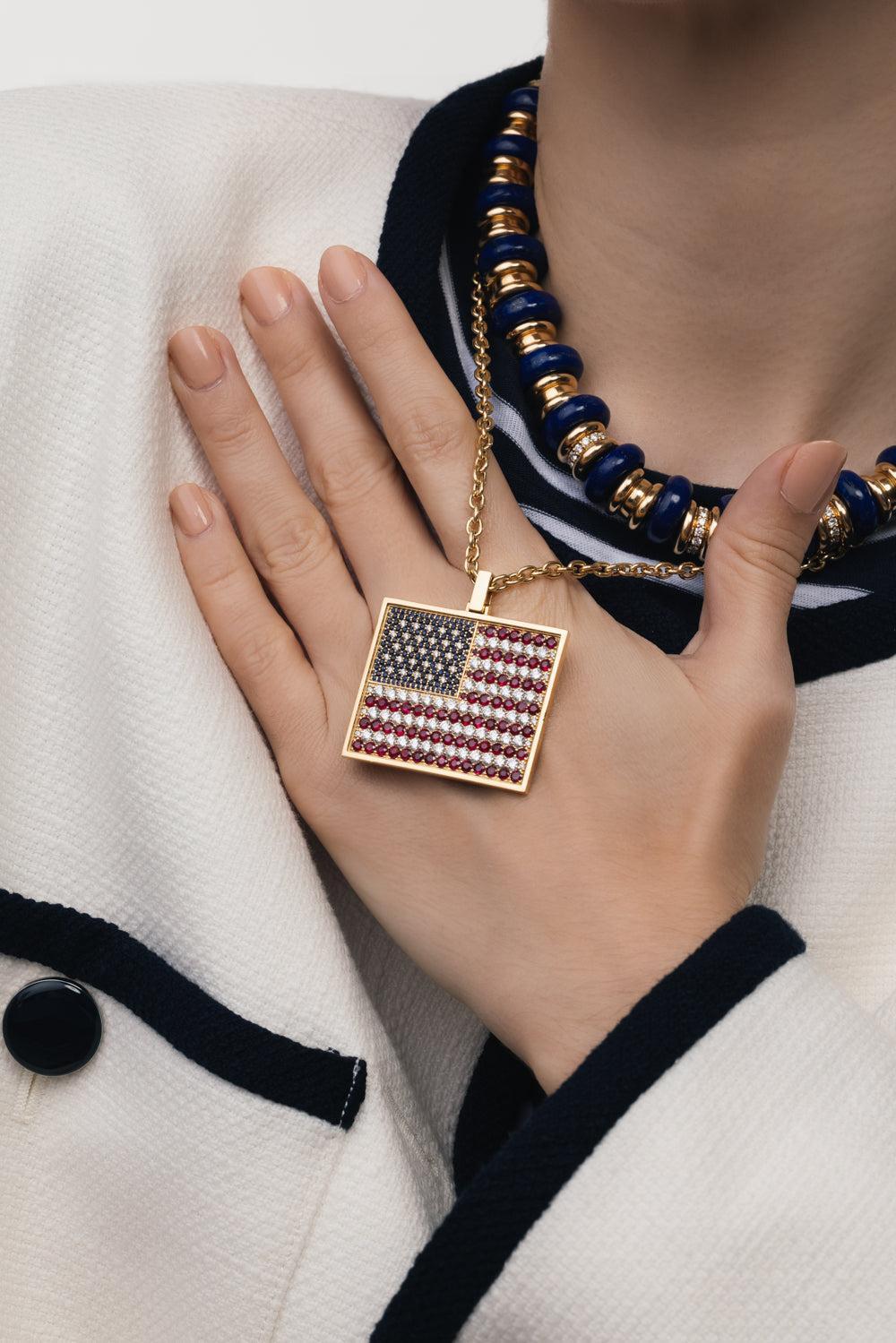Grace Winfrey american flag pendant necklace in yellow gold.