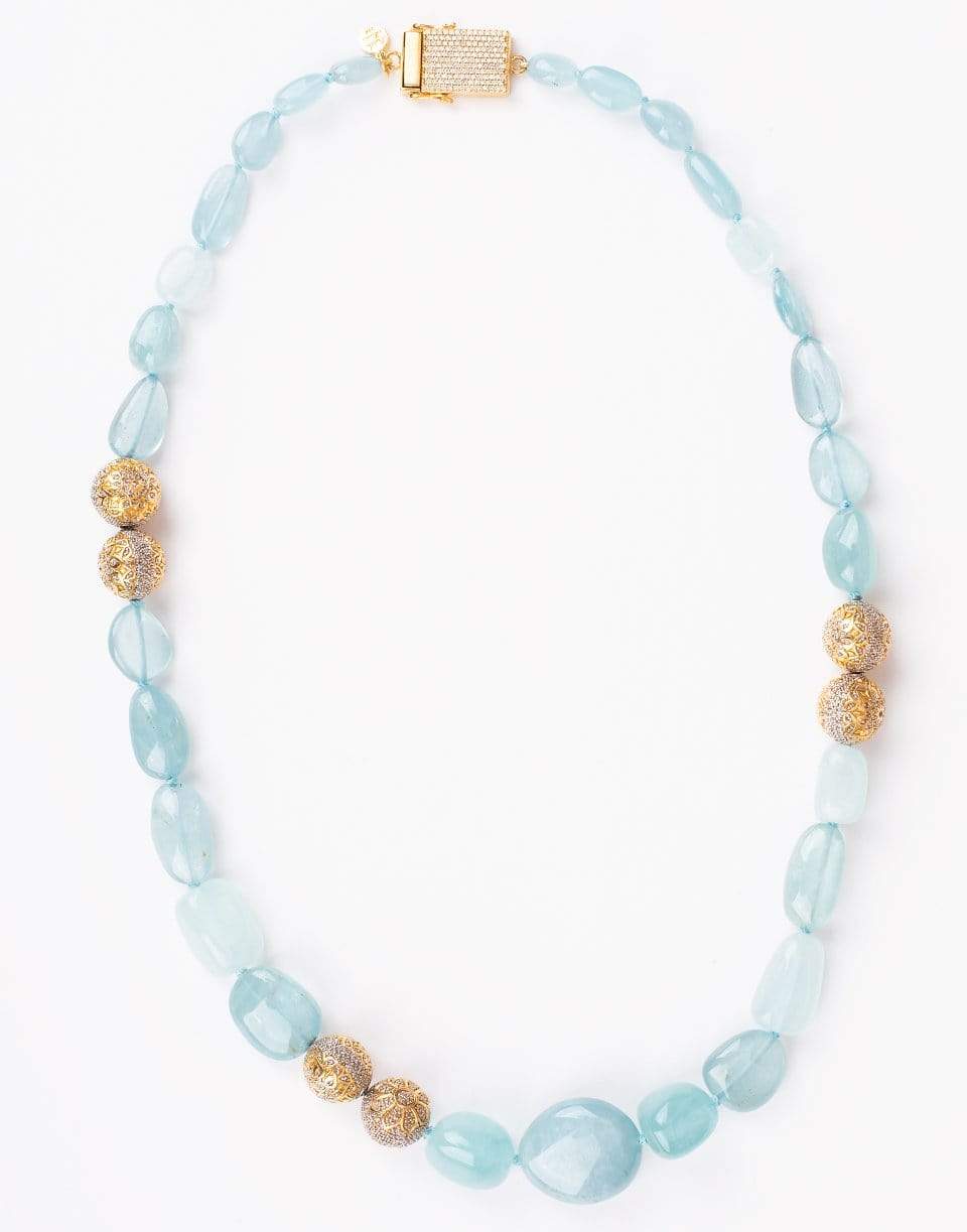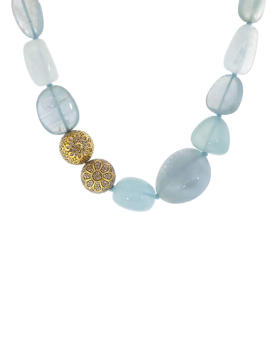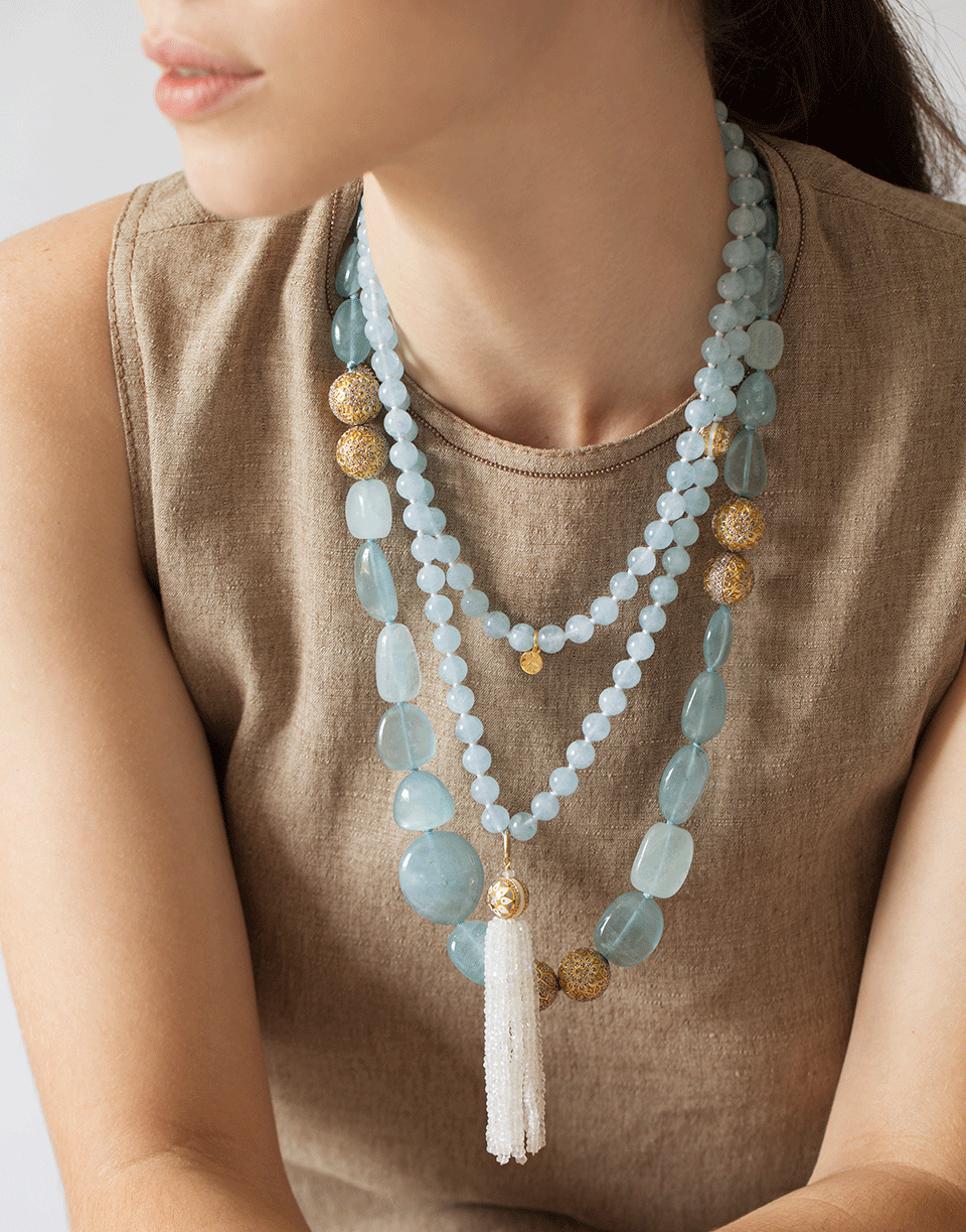 Buddha Mama strung graduated aquamarine necklace set with pave diamond mandala beads.
