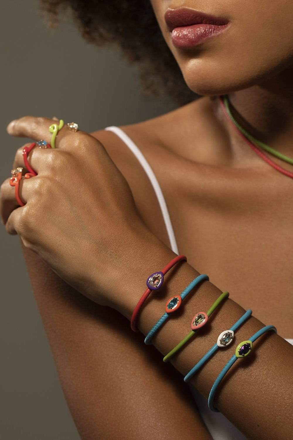 Bea Bongiasca fab bracelet with green enamel and amethyst on blue leather cord.