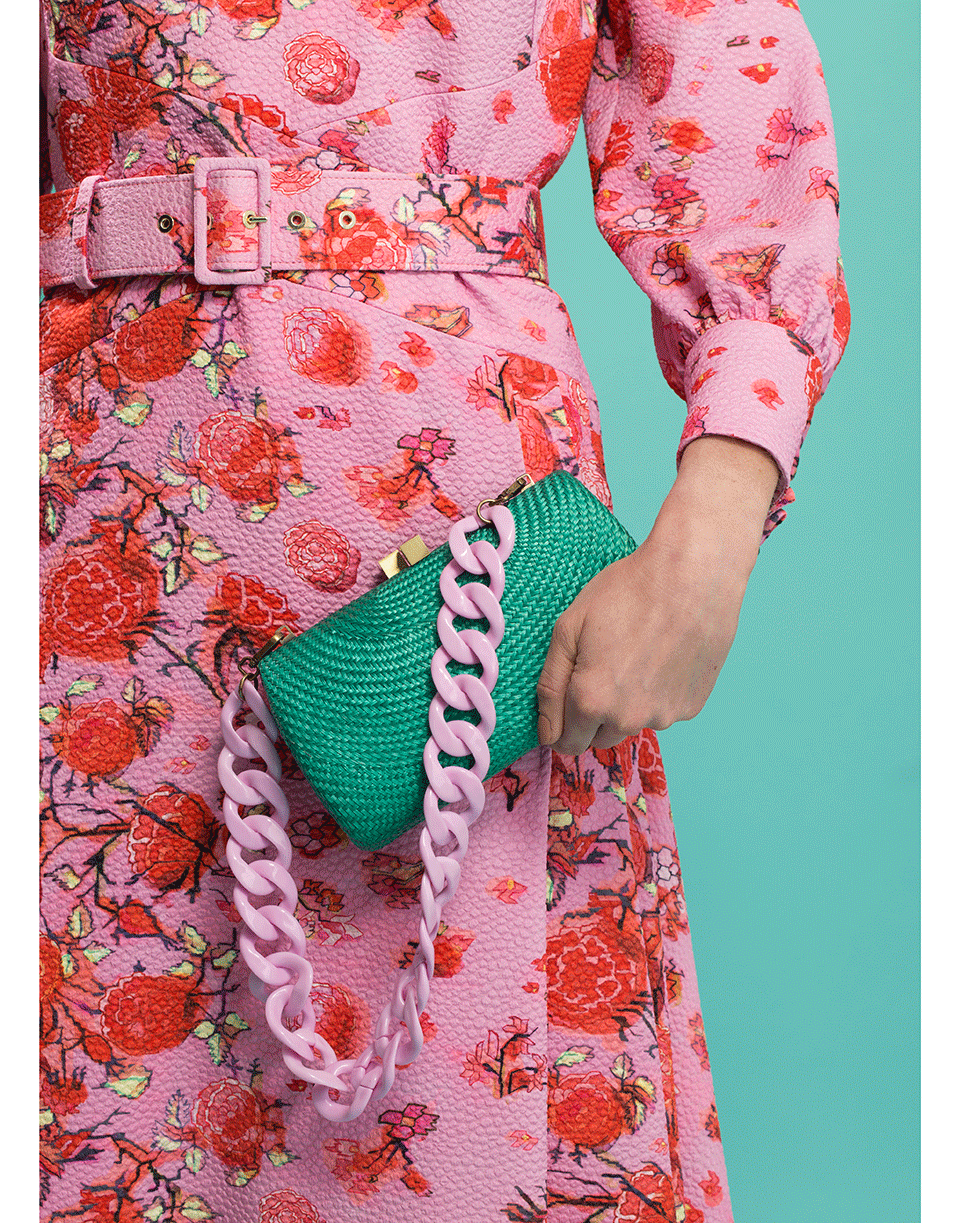 Handmade Serpui green Farah Diba Bun hard case clutch with a detachable chain shoulder strap, orange resin chain, and a magnetic closure.
