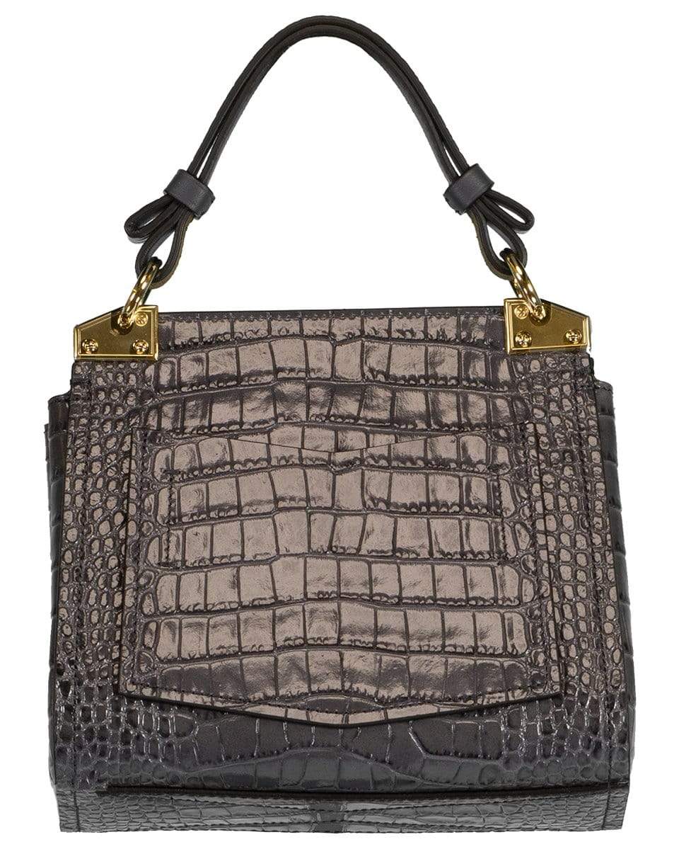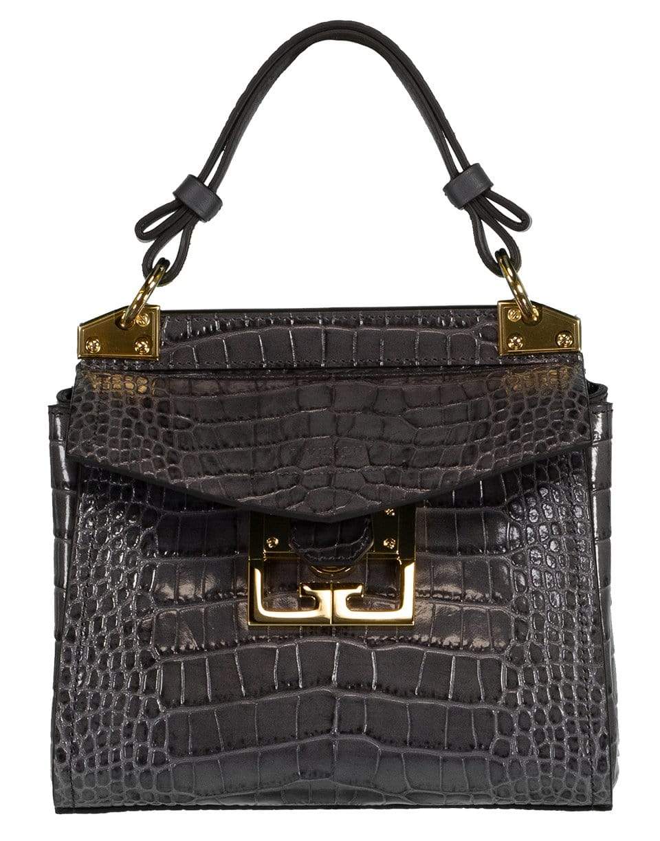 Givenchy mini croco effect Mystic tote featuring a front flap with a Double G magnetic closure, gold-tone hardware, large main compartment, exterior flat pocket, interior zip pocket, and top leather handle for toting it by hand.