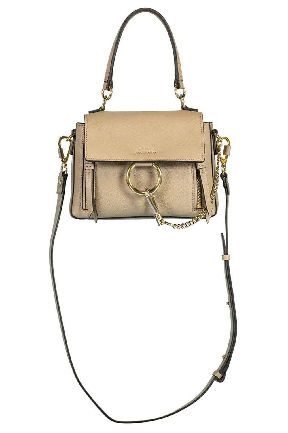 Chloe grey ring detail shoulder bag with top handle, two zip closures at front, snap closures, interior pockets, and a detachable strap.