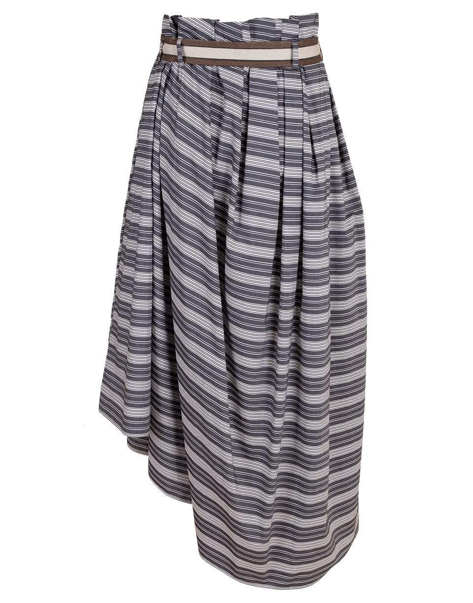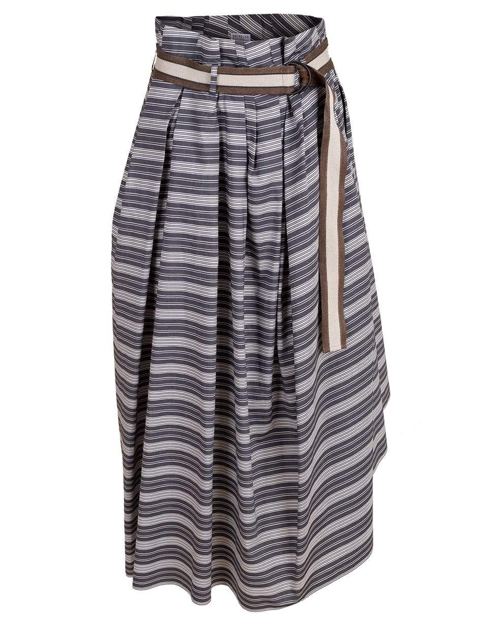 Brunello Cucinelli cotton striped full skirt with a grosgrain bicolor belt, side pockets, and a maxi length.
