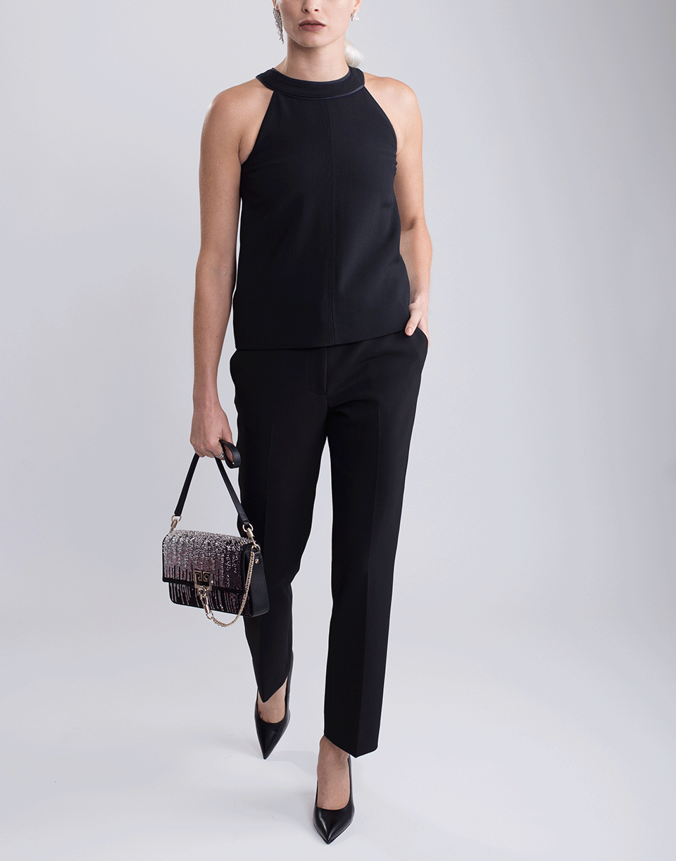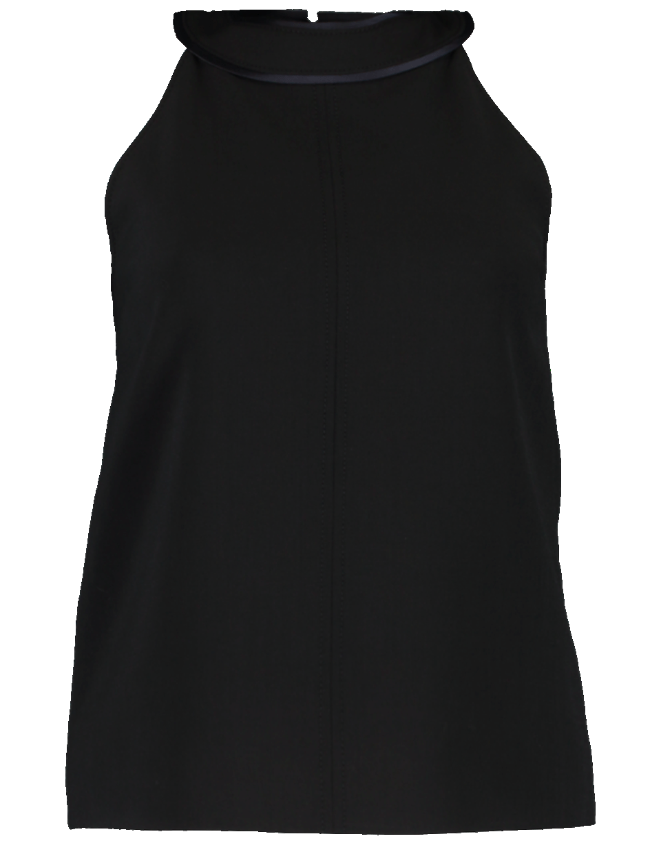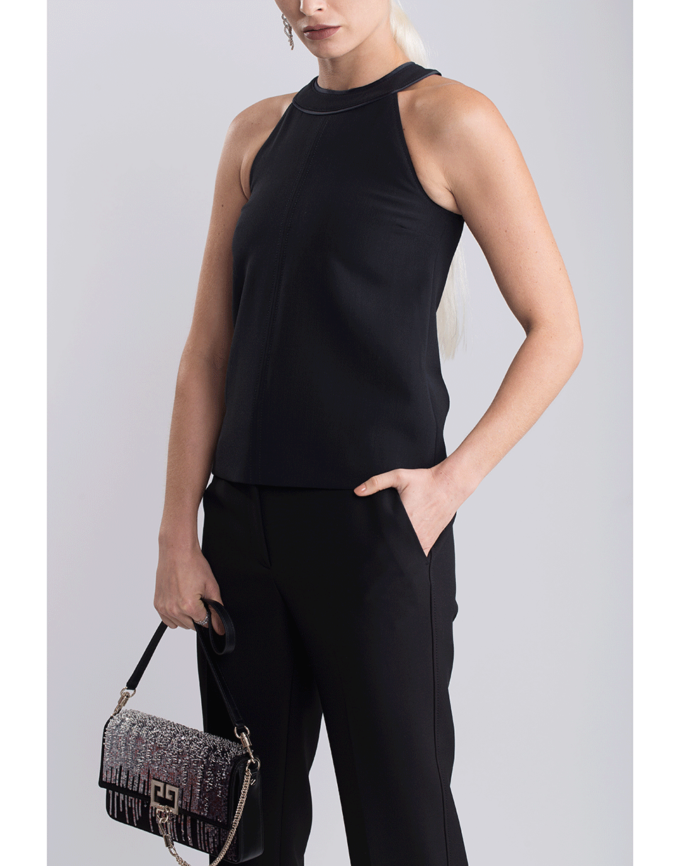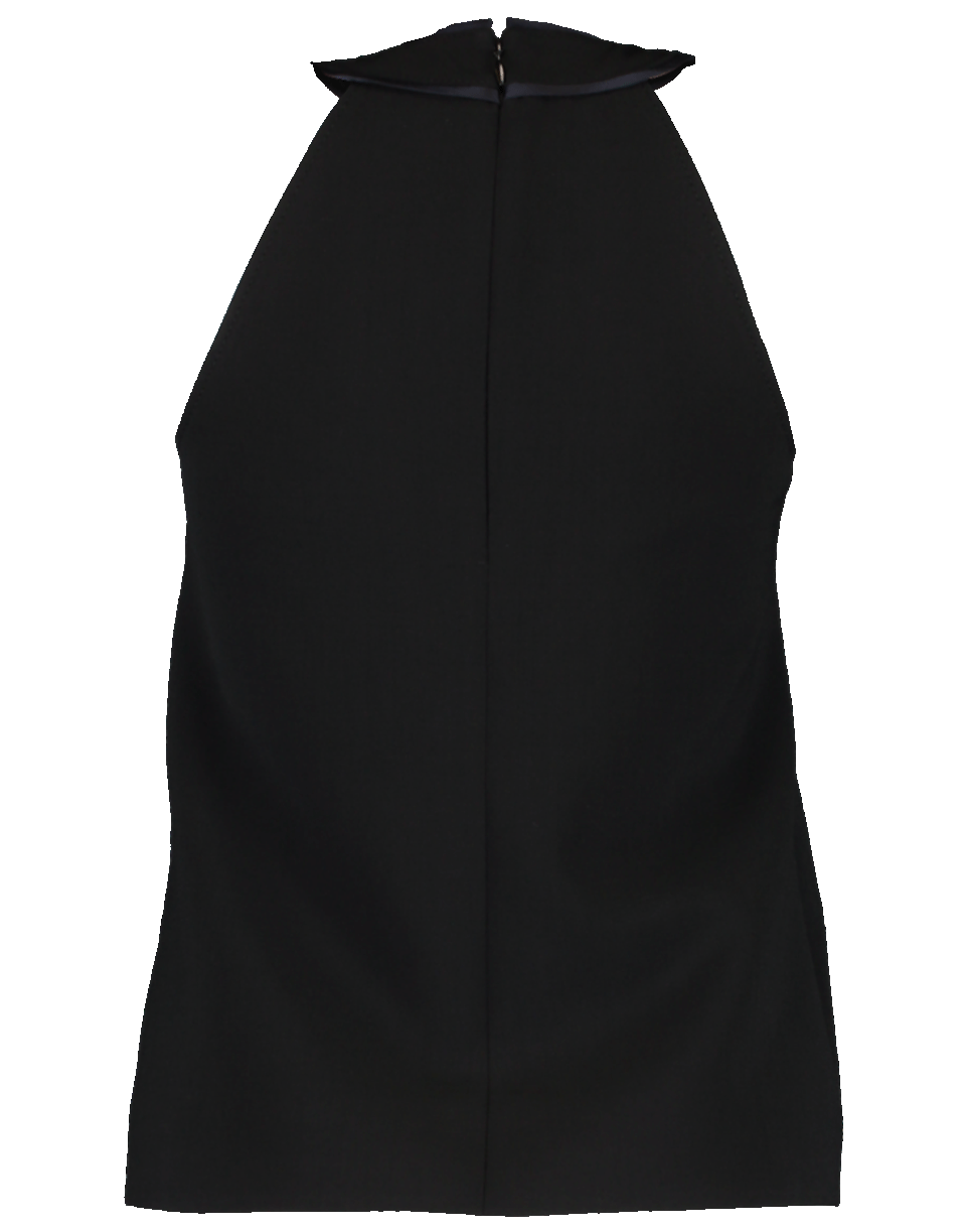 Black halter neck top by Victoria, Victoria Beckham. This sleeveless top features a high neck halter trimmed with tonal chiffon inserts, a loose slightly cropped silhouette, back zipper and hook eye closure.