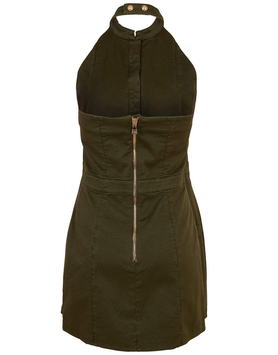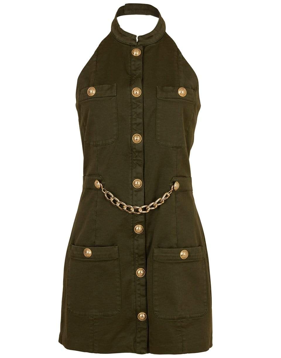 Balmain halter snap neck military dress with exposed back zip closue and front chain belt.
