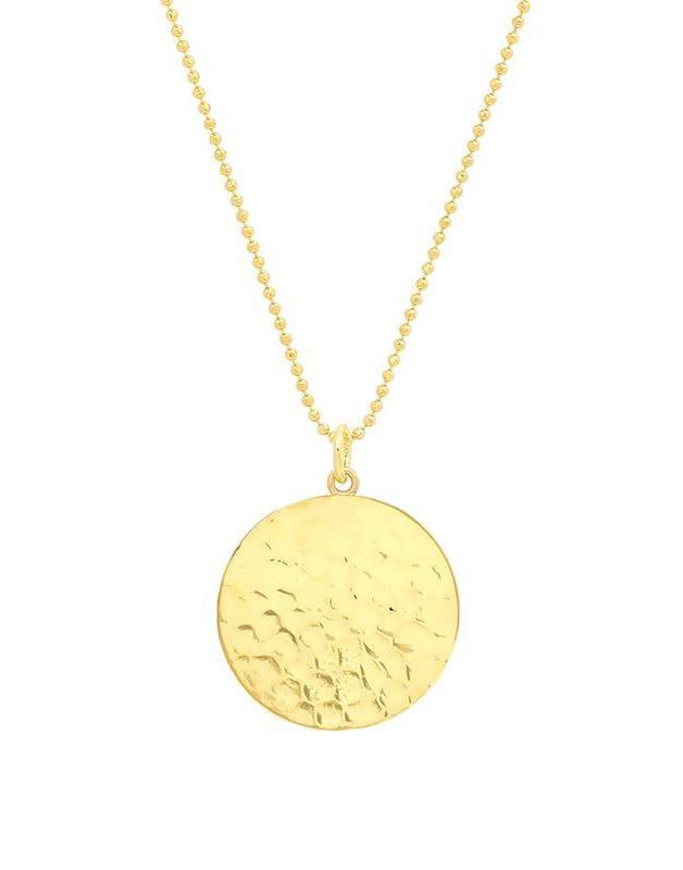Jennifer Meyer hammered disc pendant necklace. Handcrafted in hammered, subtly textured 18-karat gold, this simple (and ultra-lightweight) disc pendant hangs from a 20" bead chain. Worn alone or layered with others from the collection, this necklace will be the perfect everyday statement.