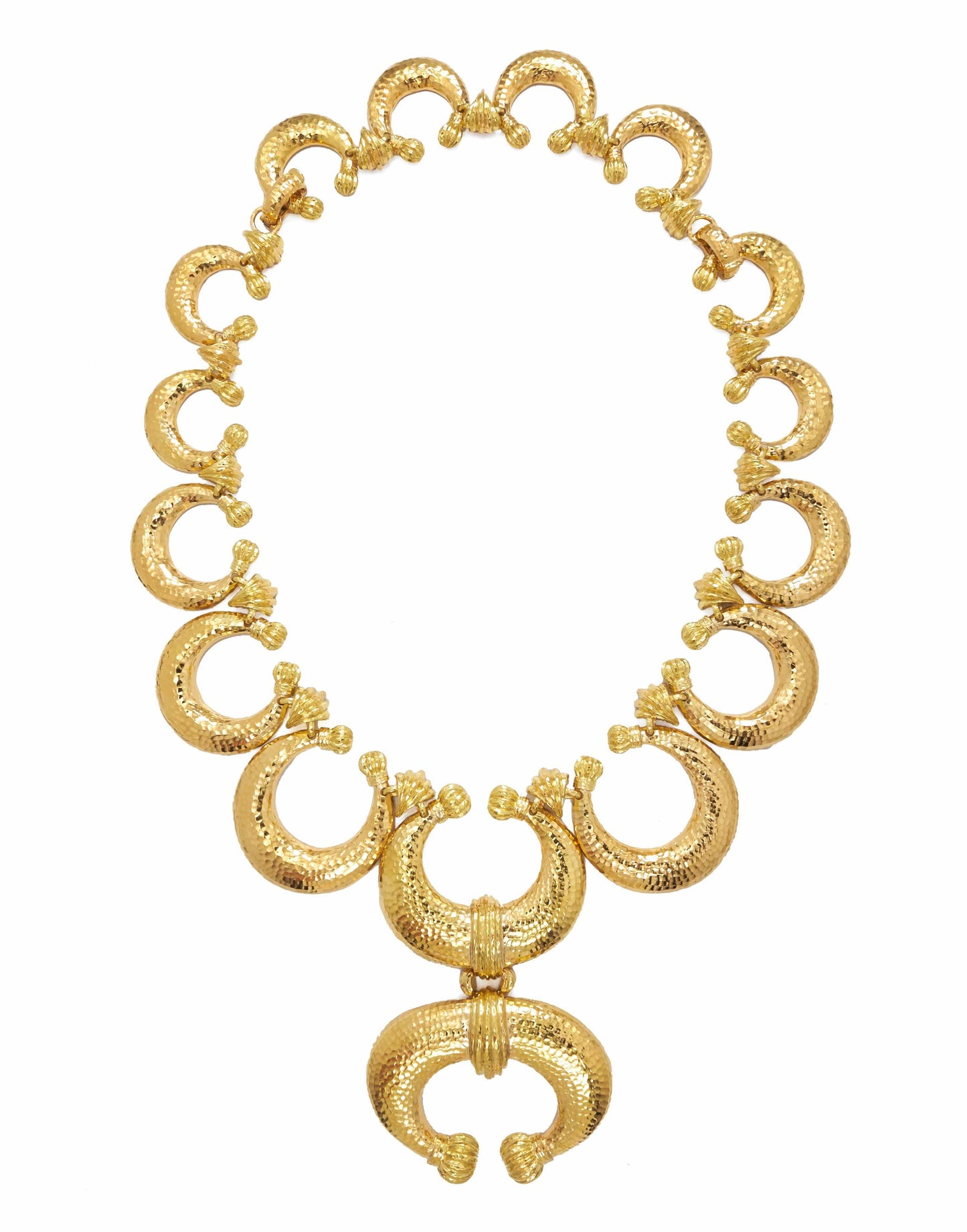 David Webb hammered gold crescent necklace from the Ancient World collection. Hammered 18K gold, with detachable 6 inch extension.