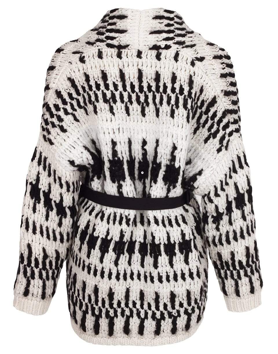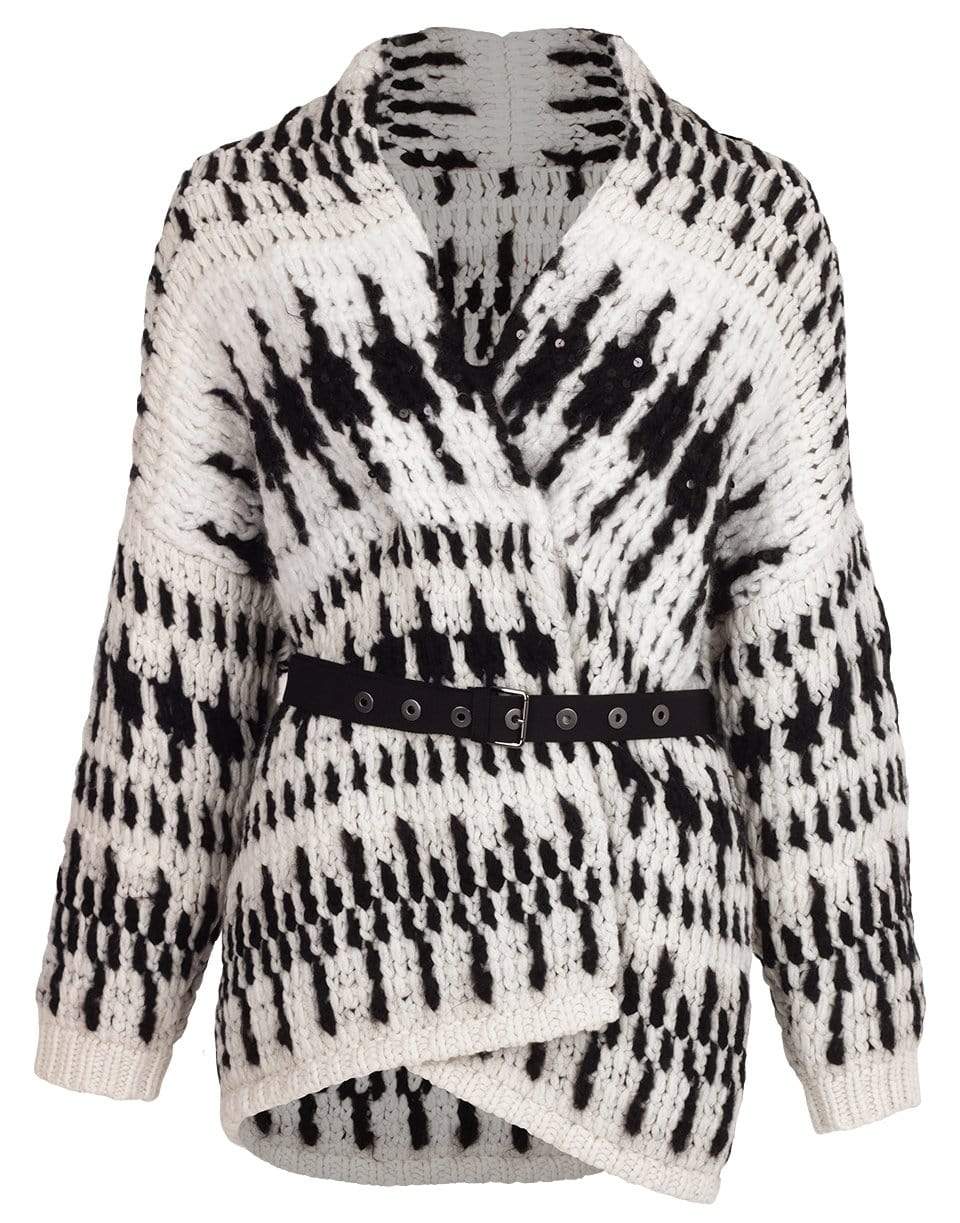 Black and white cashmere mohair cardigan from Brunello Cucinelli featuring a relaxed fit, shawl collar, long sleeves, Nordic-inspired print, side pockets, and finished with a grosgrain grommet belt.