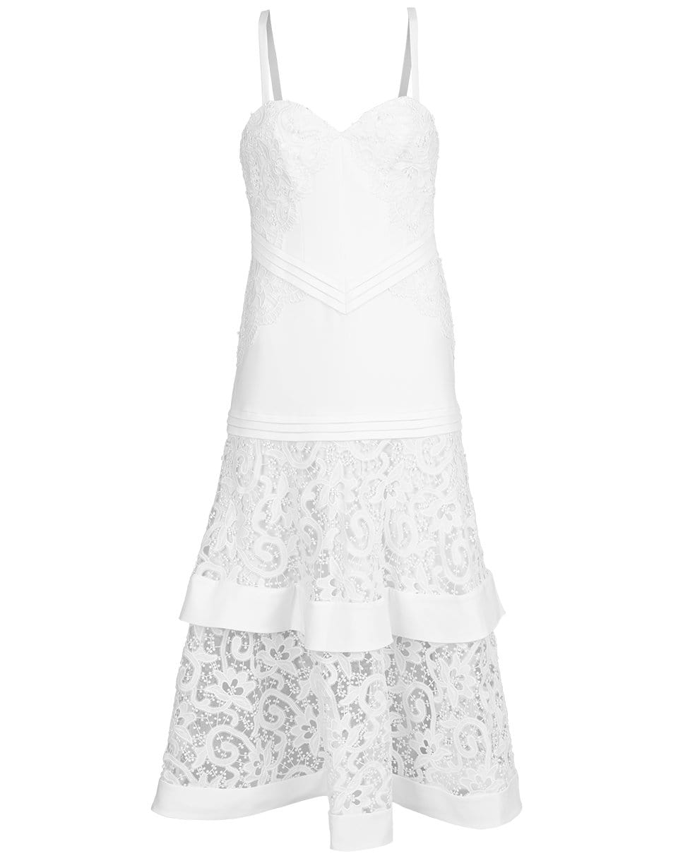 Alexis Harlow dress with thin straps, sweetheart neckline, lace sheer hem, all over eyelet detail, fitted bodice, and a zip fastening at back.