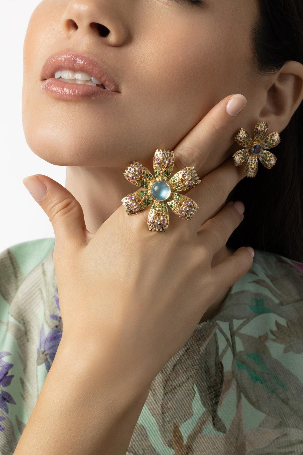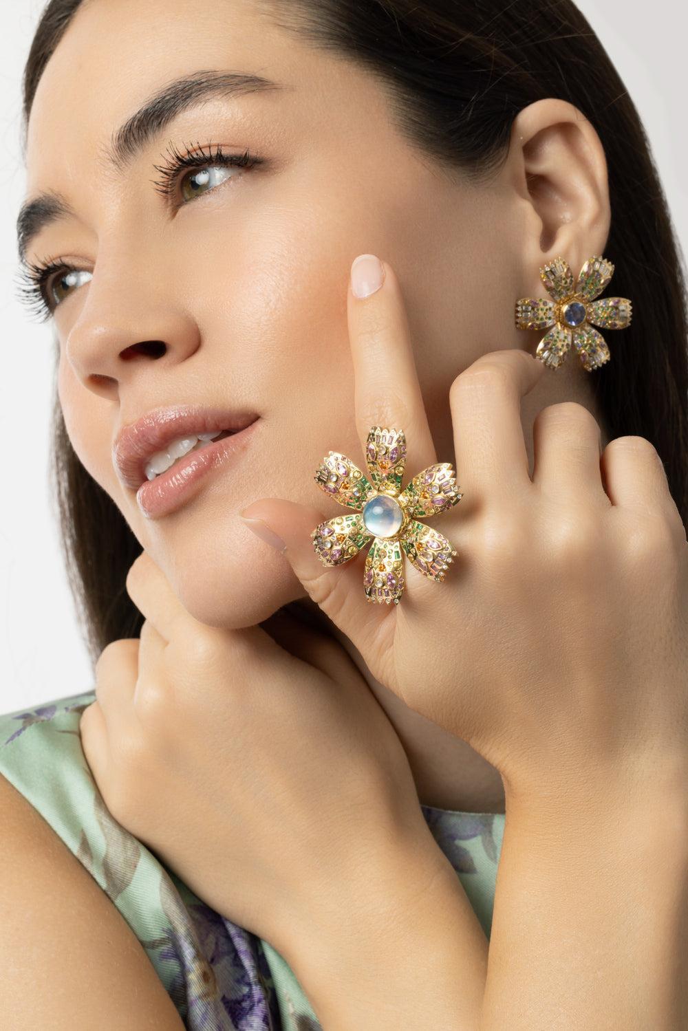 Harwell Godfrey moonstone poppy ring in yellow gold.