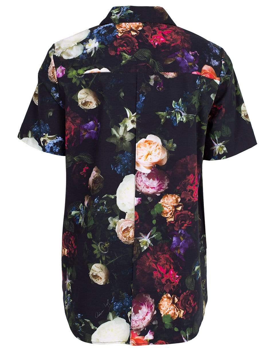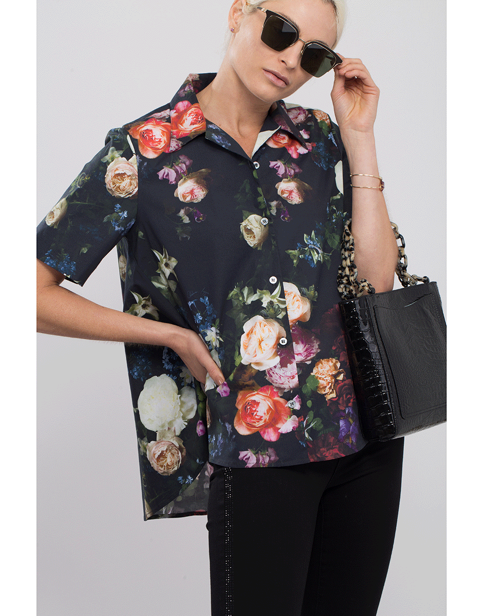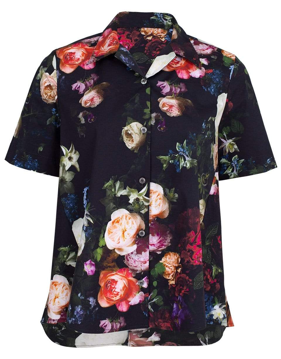 Printed poplin Hawiian trapeze top from Adam Lippes featuring an oversized fit, short sleeves, spread collar, button front fastening, and a split hem.