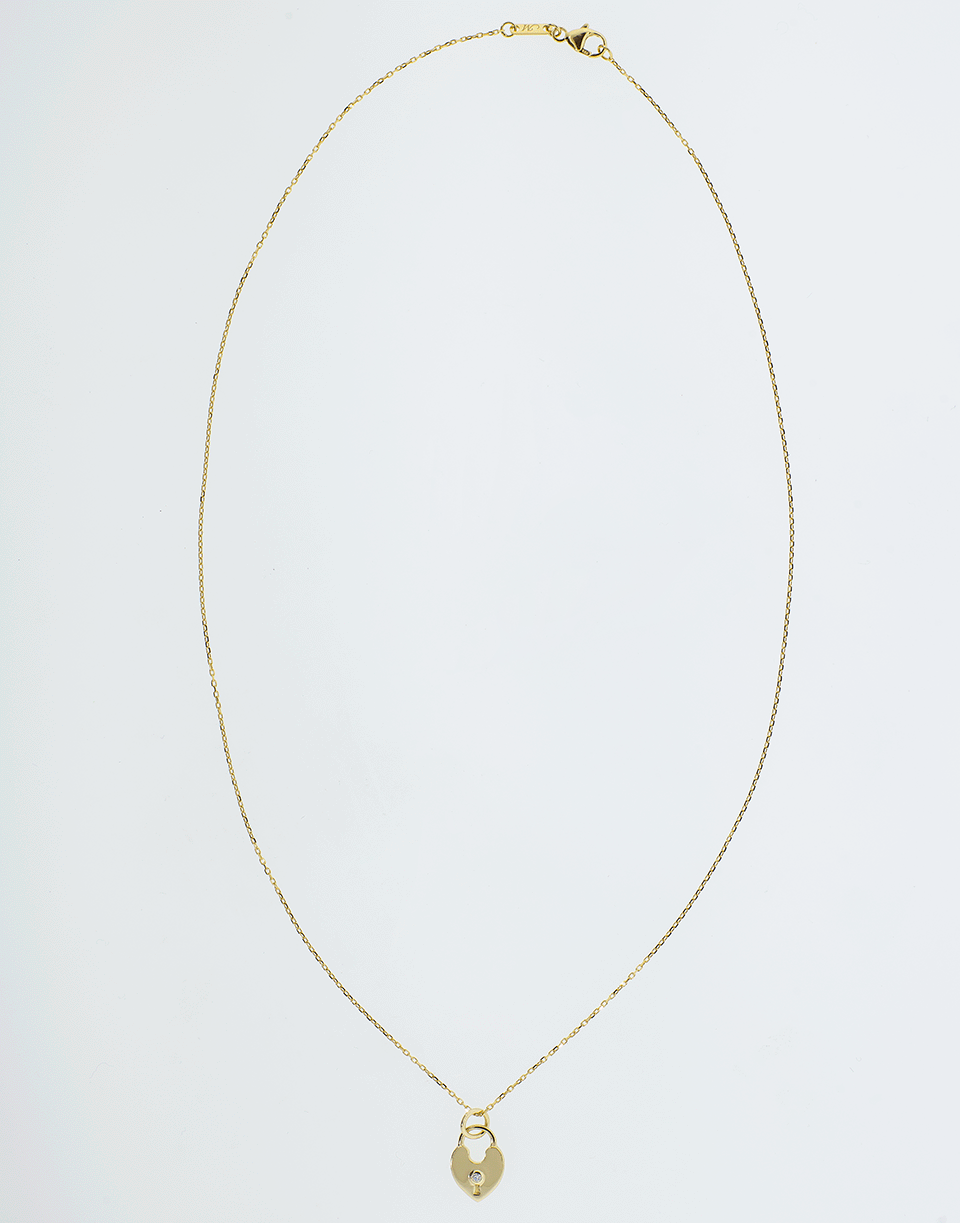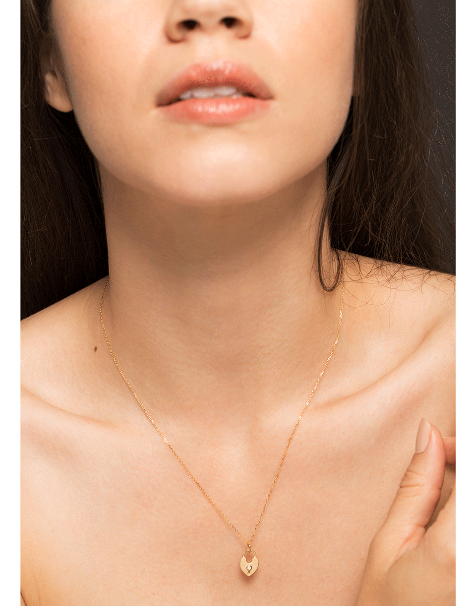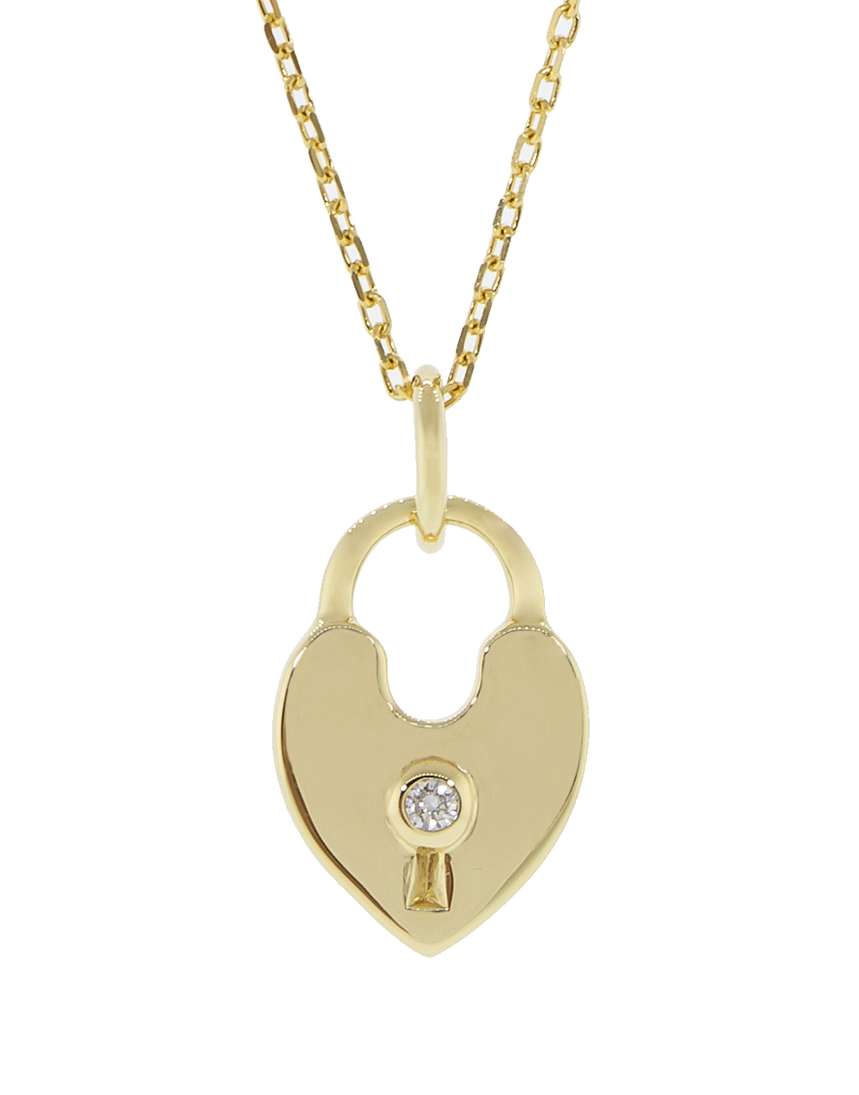 This heart lock charm necklace from Monica Rich Kosann features a lightweight 18k yellow gold heart lock charm with a diamond keyhole and a delicate 17” black steel chain.