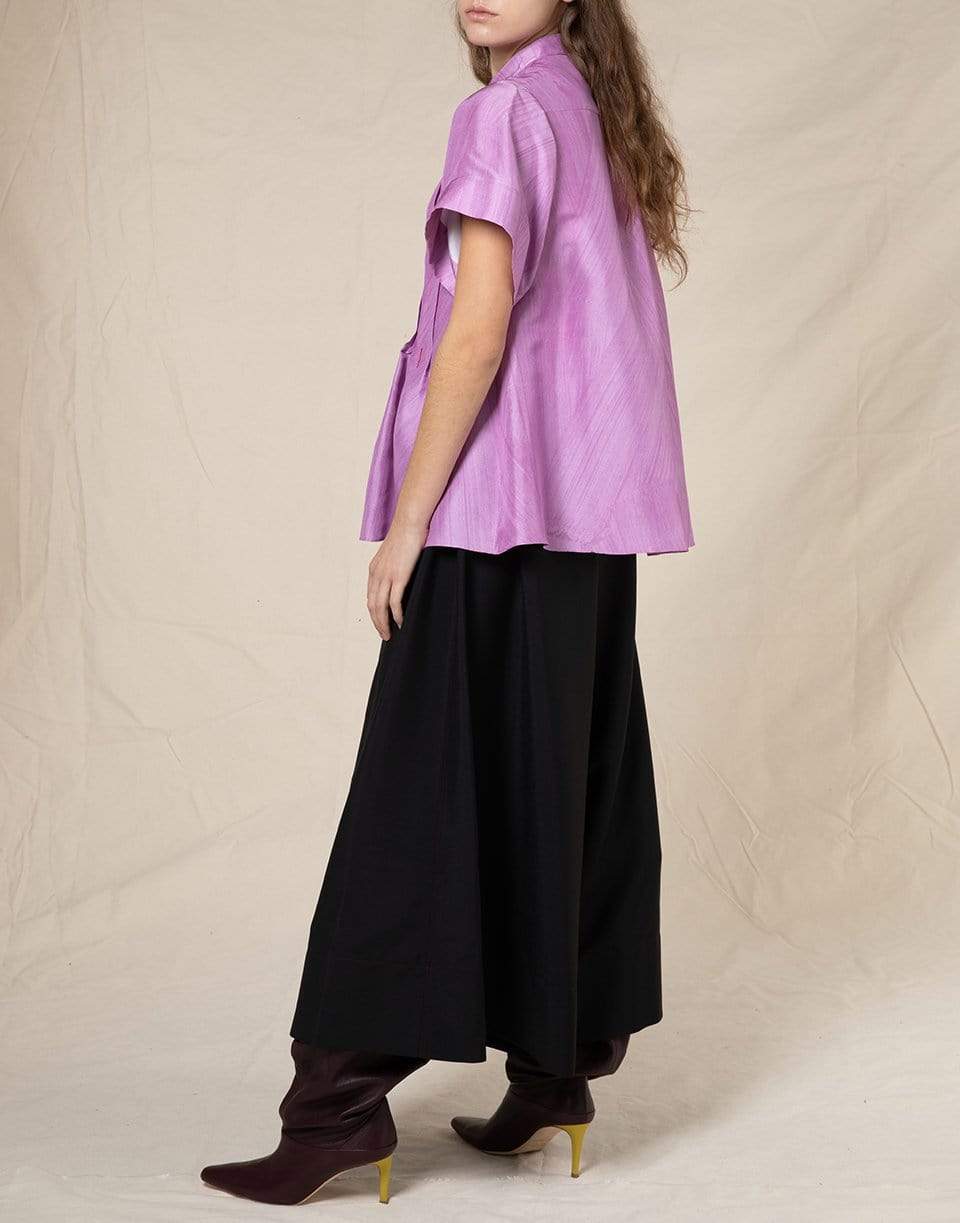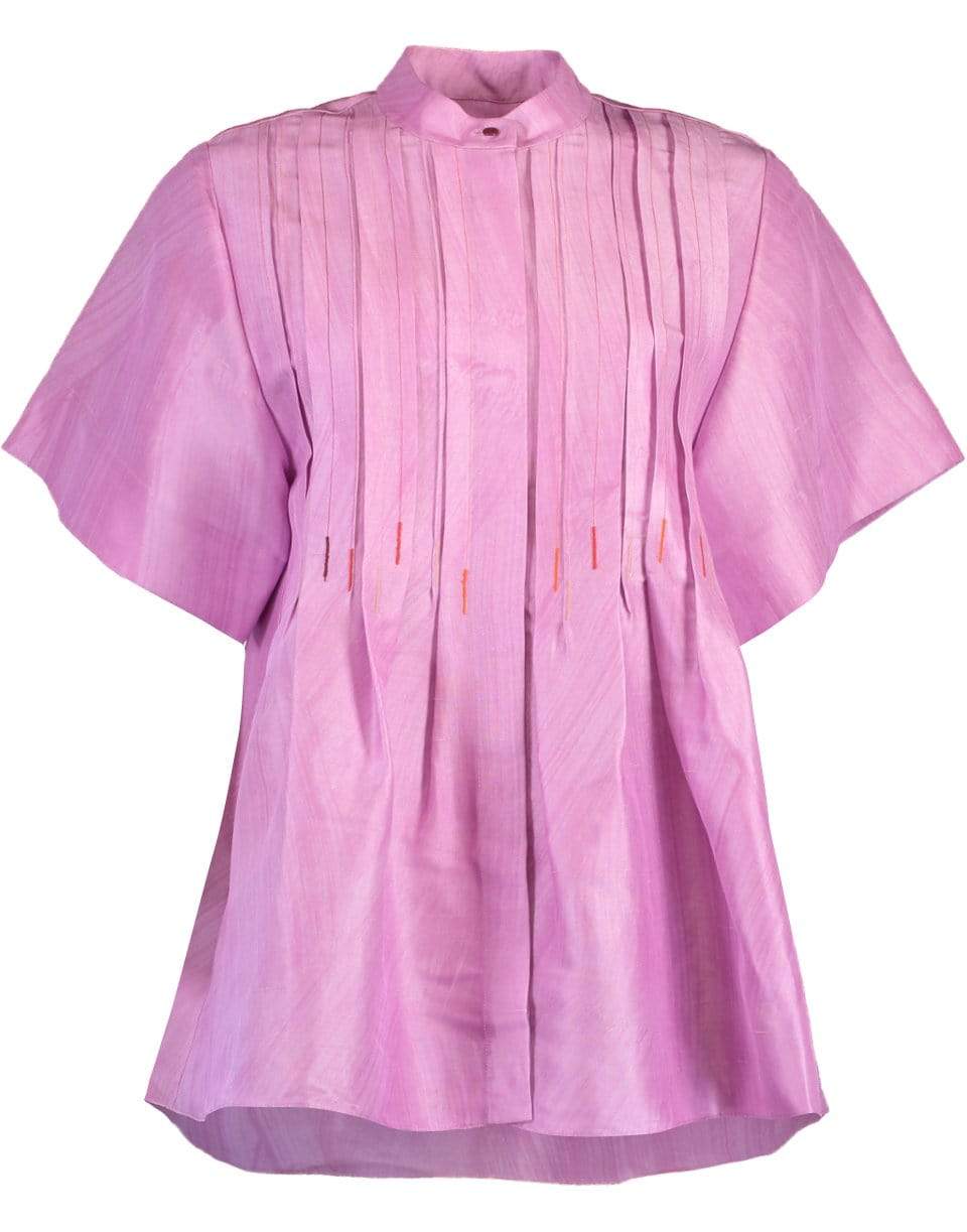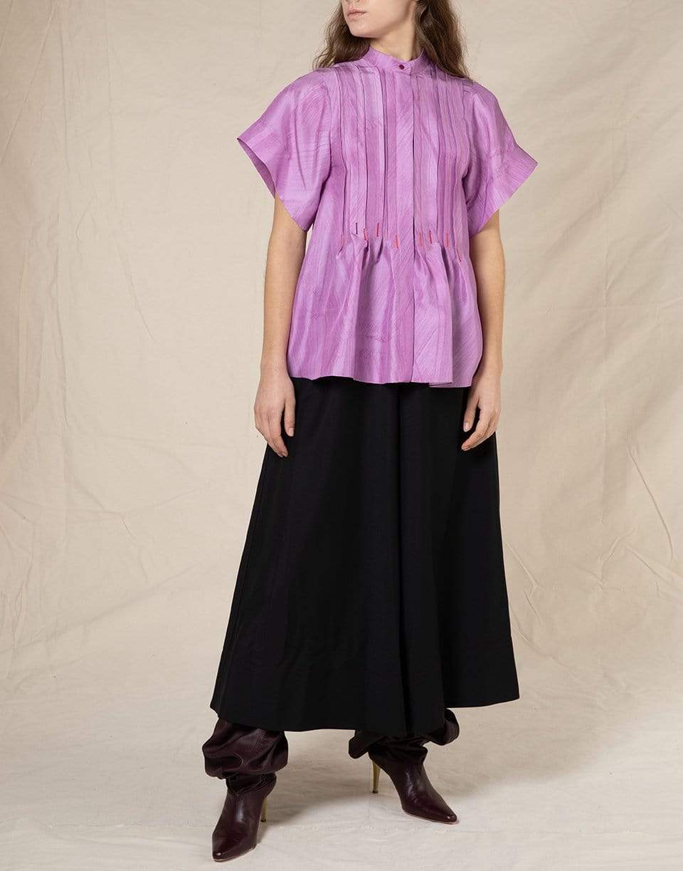 Roksanda Ambre silk blouse in heather features a mandarin fastened front neckline, short flare sleeves, pleated from detail and peplum hem.