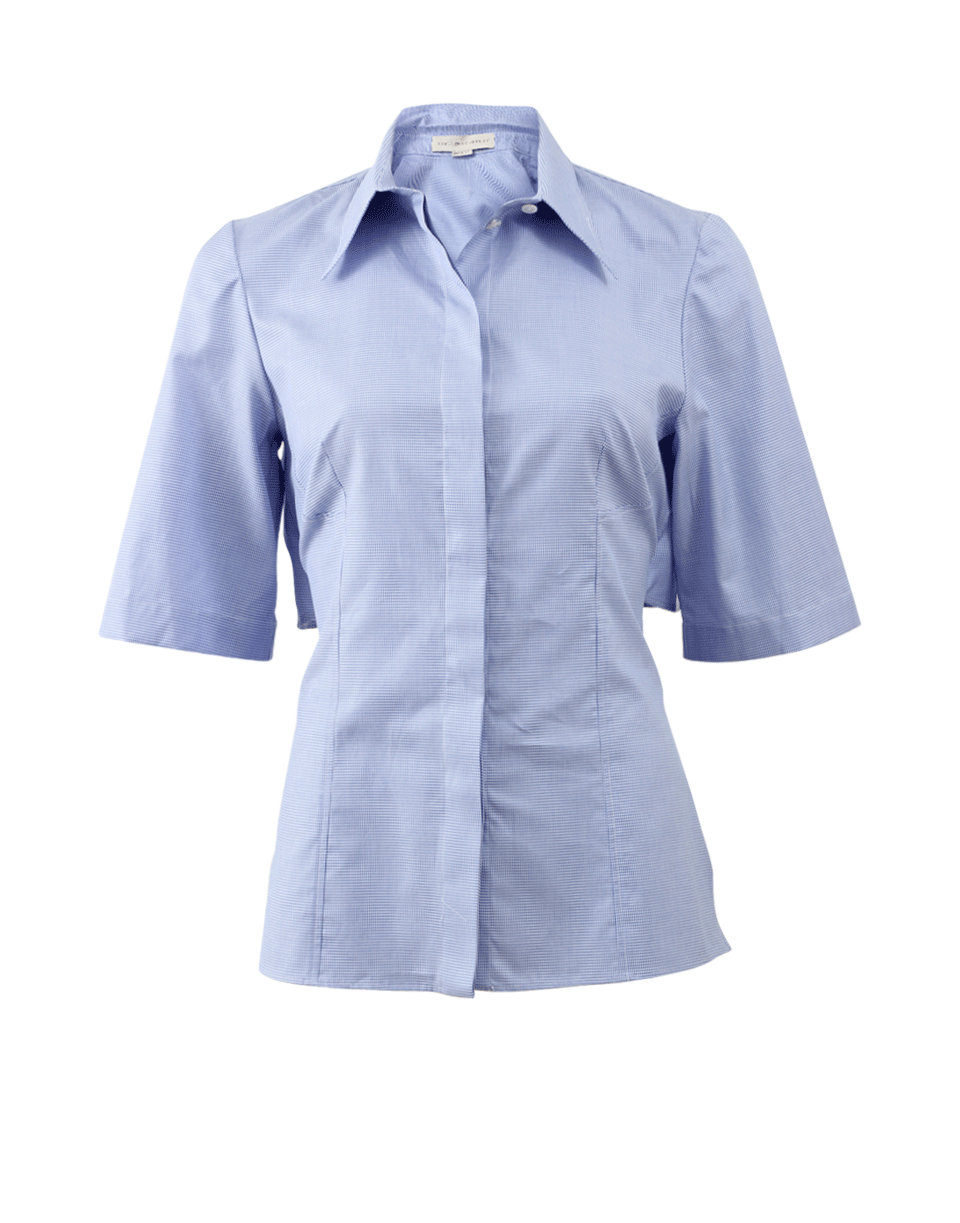 Spread Collar With Hidden Button And Placket Closure, Contour Darting With Elbow Length Sleeves, Side Vents
