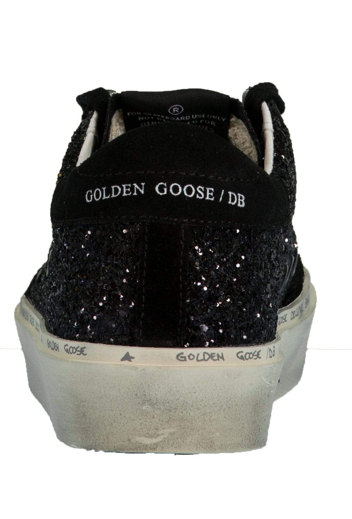 Black low top leather sneakers from Golden Goose featuring an effortlessly cool distressed design with black sequin accents thoughout, leather star, and a lace-up style.