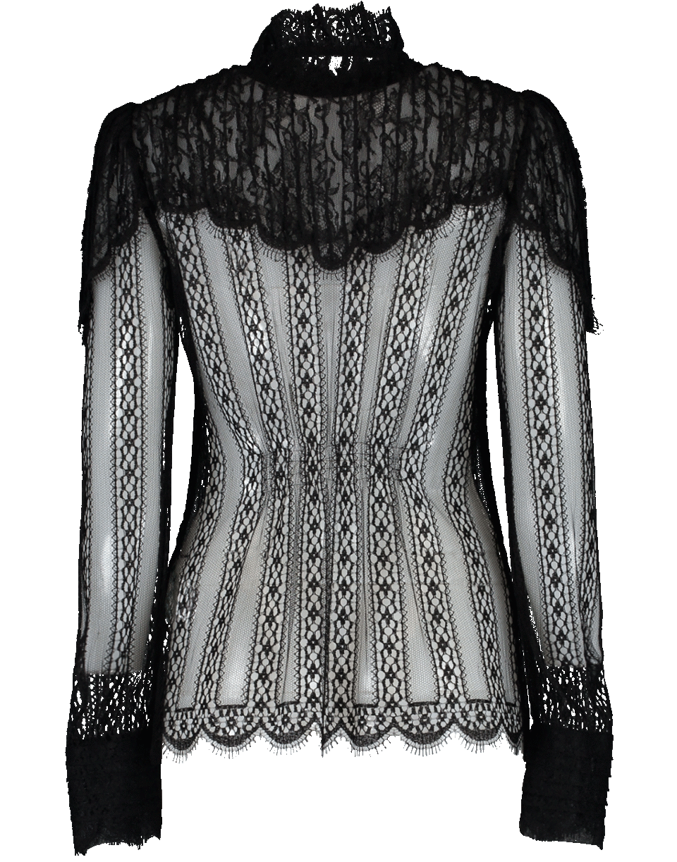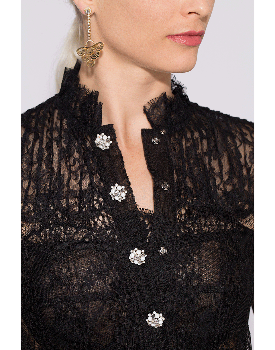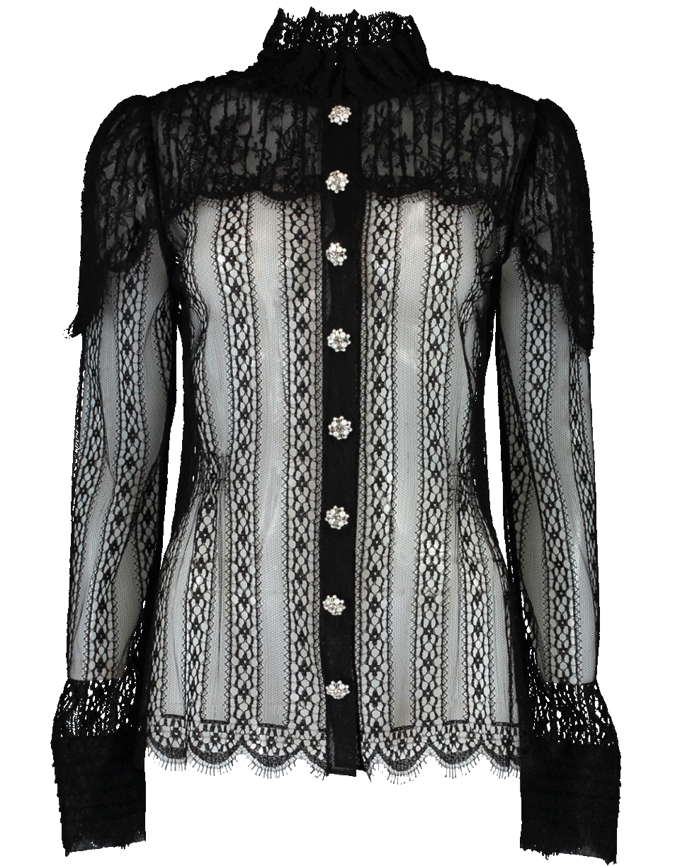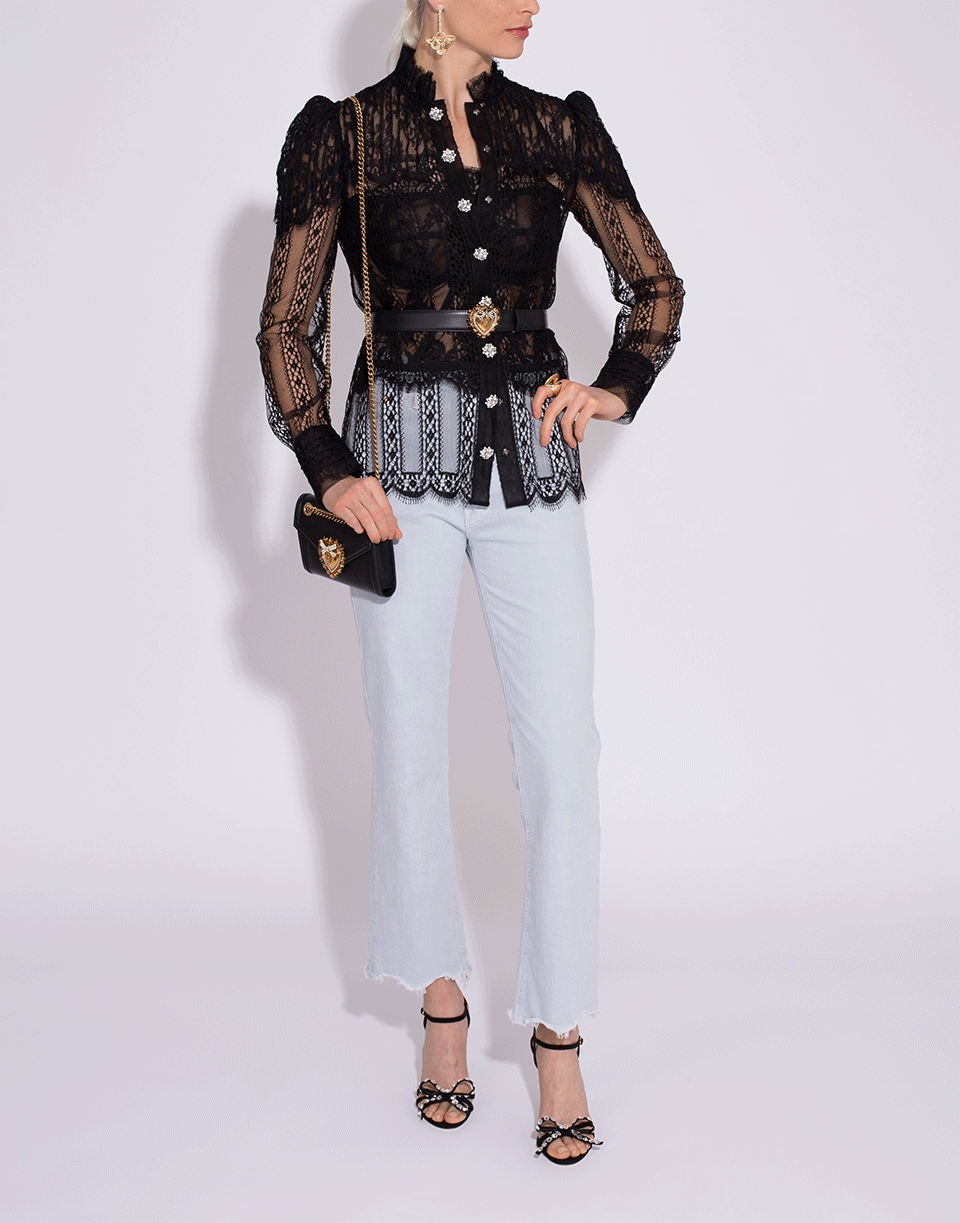 Dolce & Gabbana chantilly blouse. This blouse features a high lace jewel neckline with front button closures and long sleeves. The sheerness requires an underlay and has a form fitting silhouette.