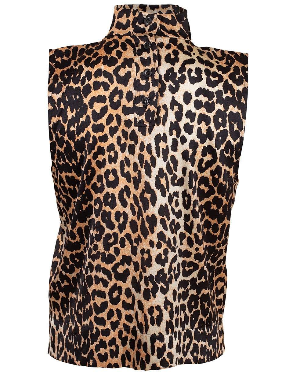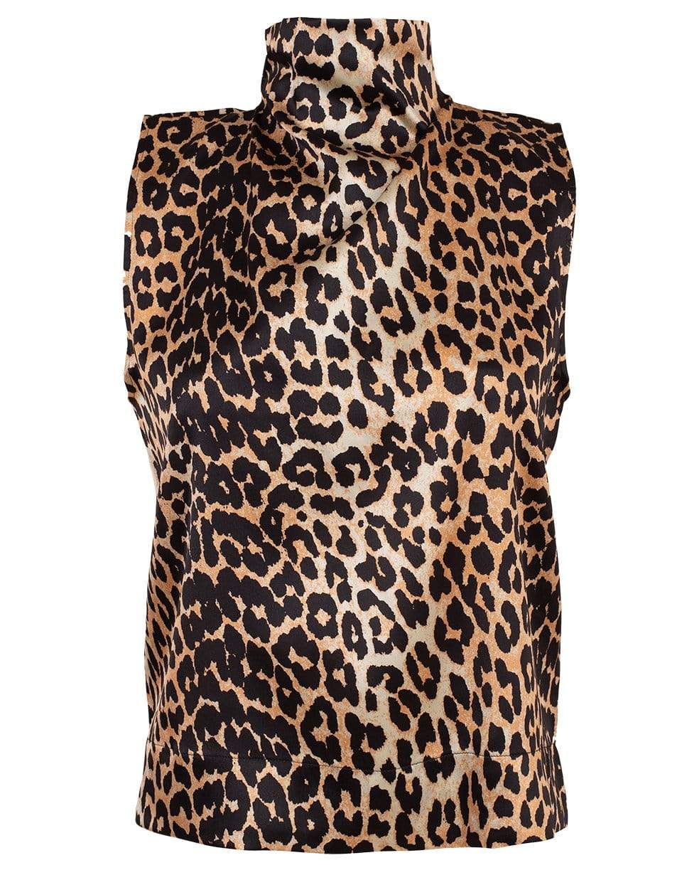Sleeveless silk stretch satin leopard print draped top from Ganni featuring a relaxed fit, draped high-neck, and back button closure.