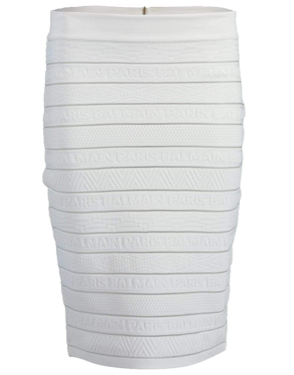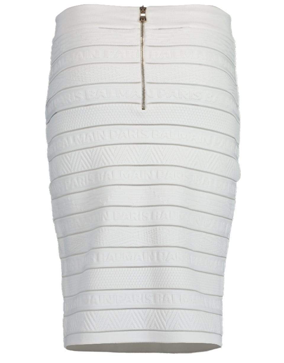White Balmain woven skirt with a skin tight fit, high waist, elastic waistband, embossed branded and mesh panels, ribbed trims, exposed gold-tone hardware at back, and a knee length.