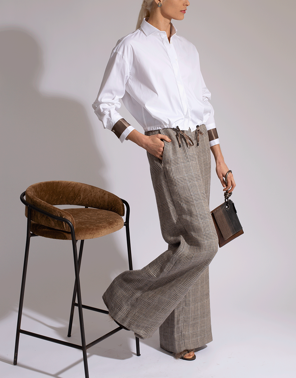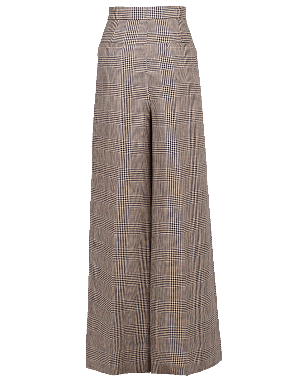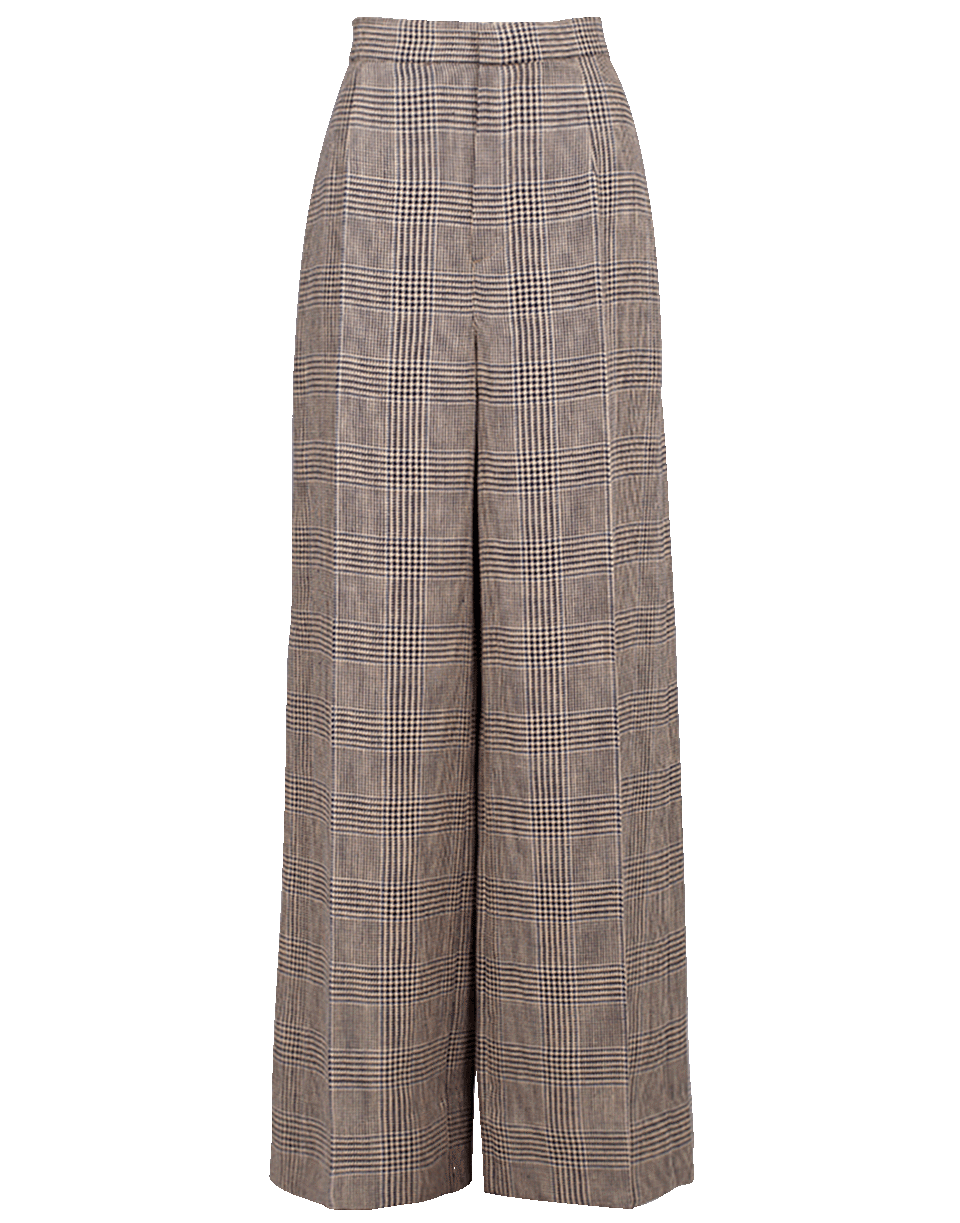 Linen Prince of Wales high waist trousers by Brunello Cucinelli. Crafted from pure linen, these pants were made for the modern woman. They feature a loose silhouette, high-rise waist, wide flared leg hidden button-zip fly, side slip pockets, back welt pockets and a sophisticated plaid print that ties the garment together.