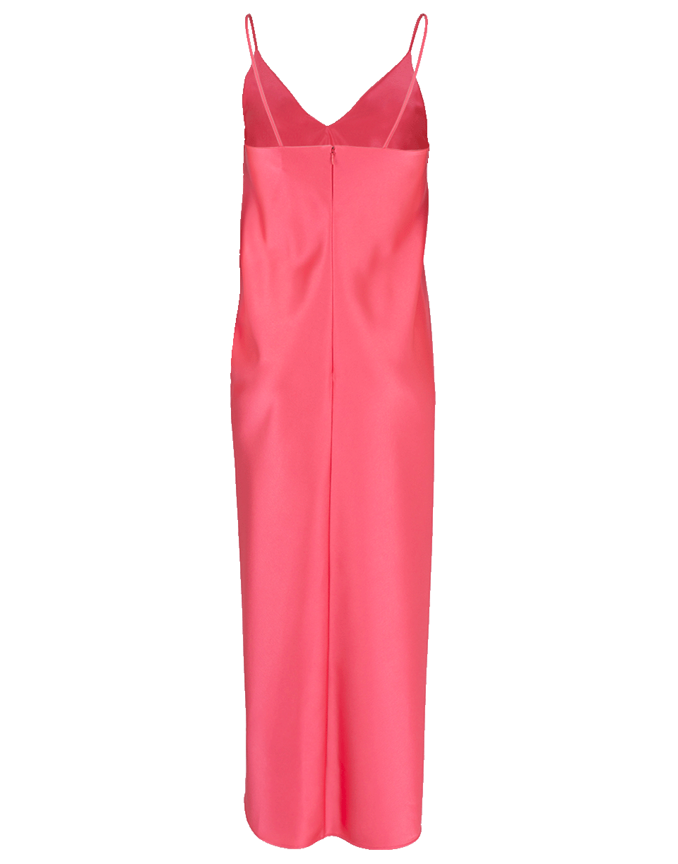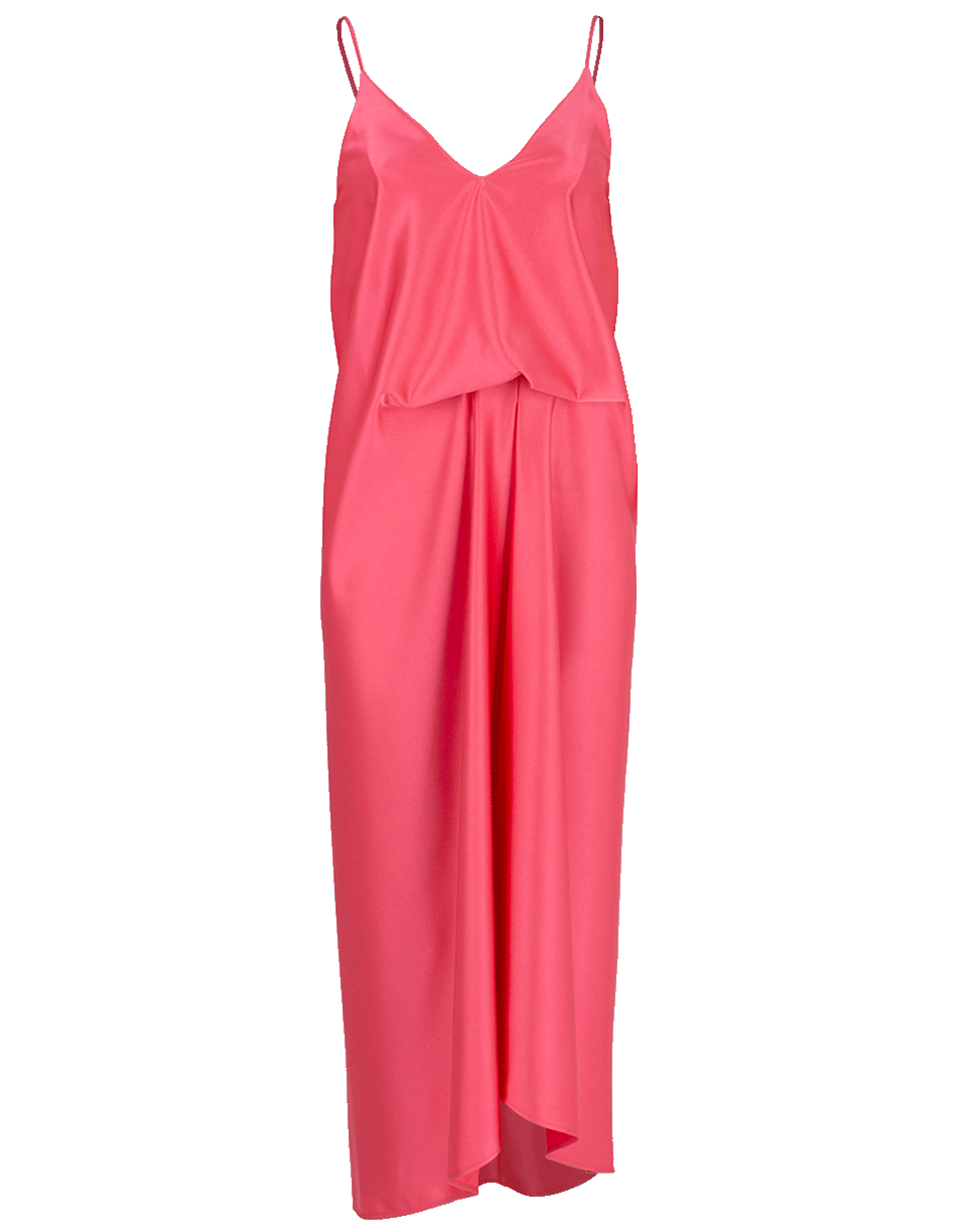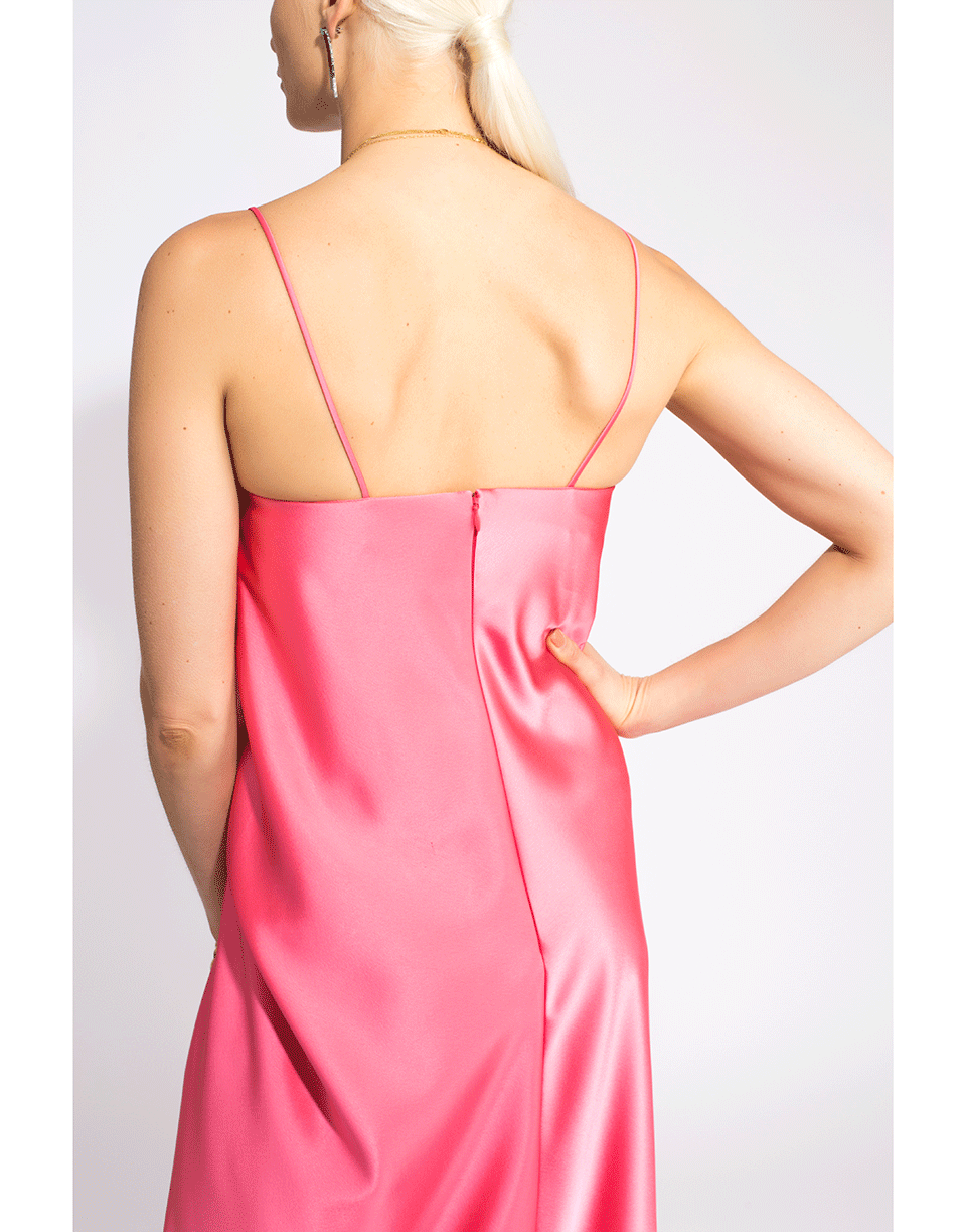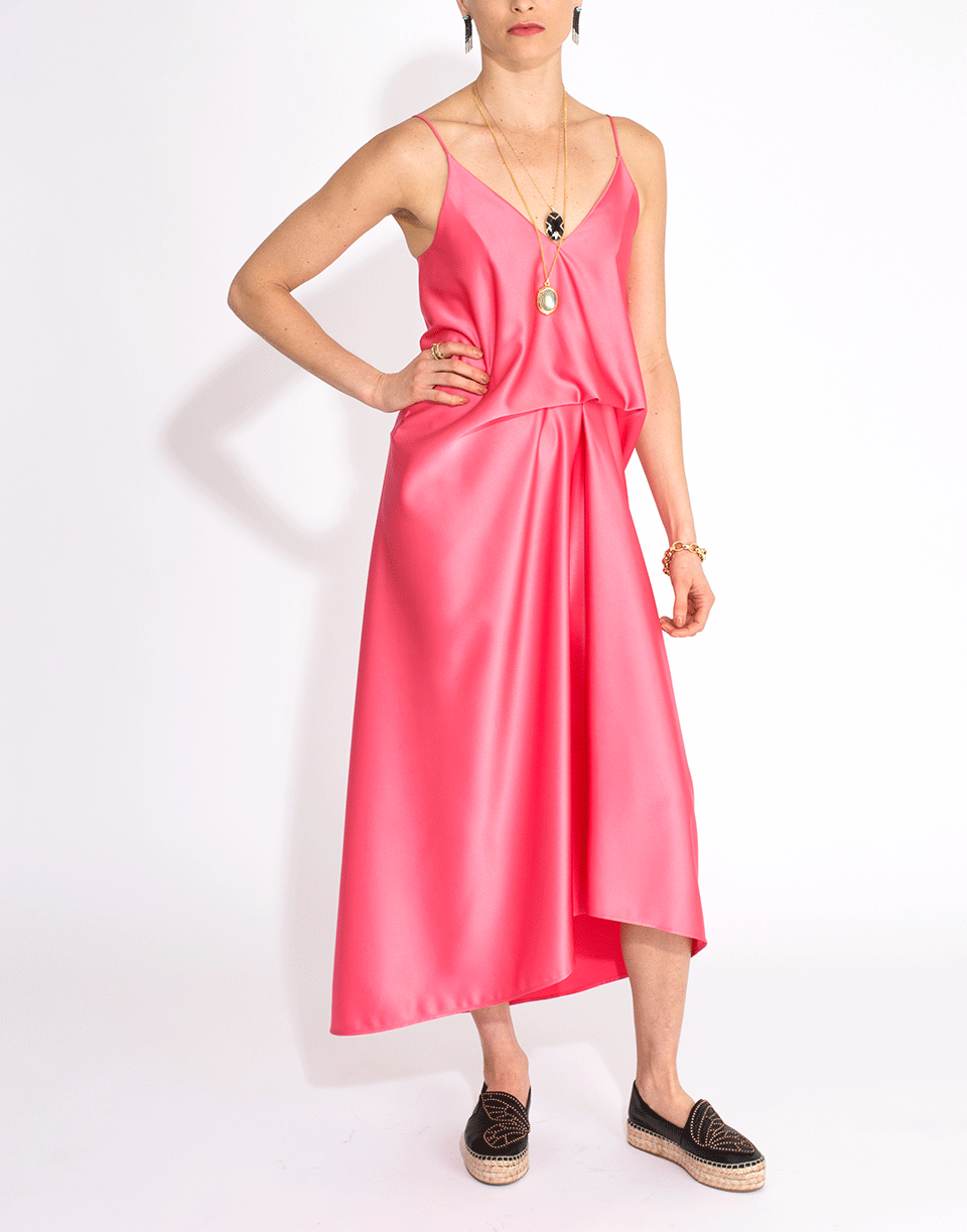 Sleeveless hot pink dress by Cedric Charlier. This sleeveless midi dress is gathered at the waist and folds over to create an asymmetrical hem. It features a concealed hook and zip fastening at back, and a slip silhouette with a v-neckline and spaghetti straps.