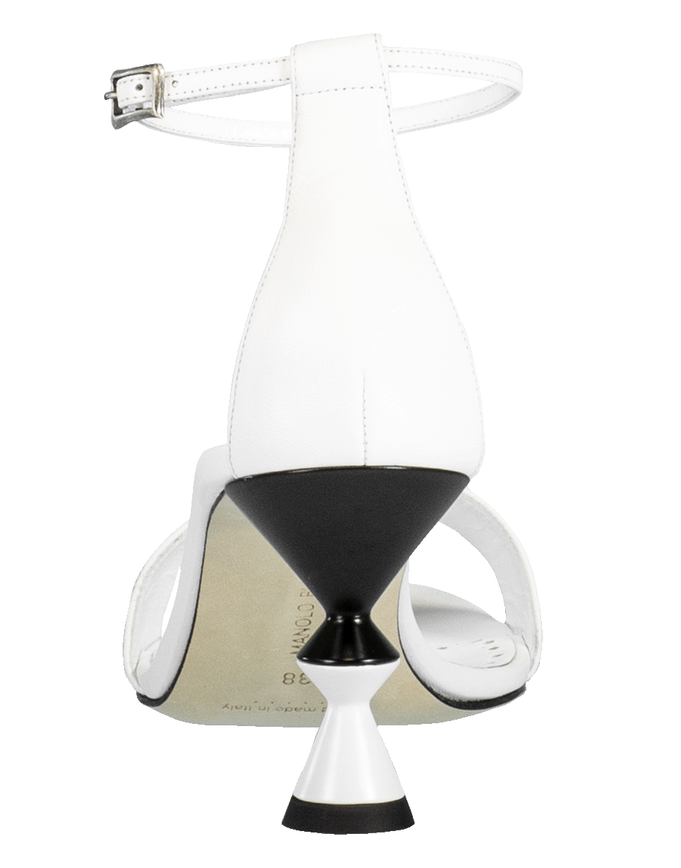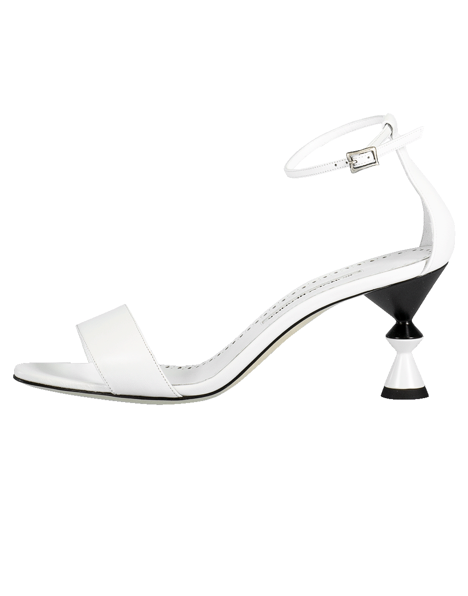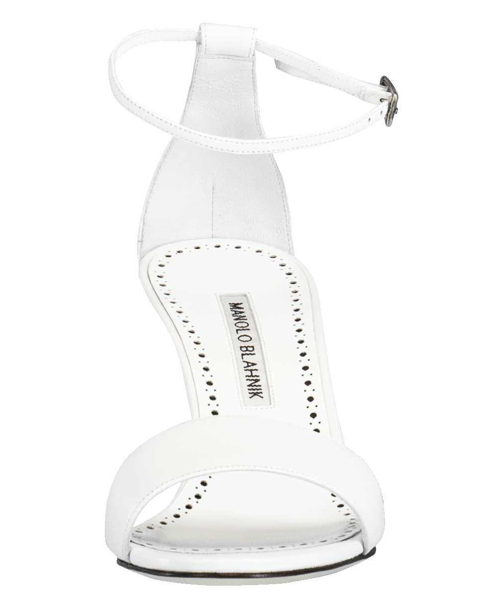 ‘Leda’ sandal by Manolo Blahnik. These white leather sandals feature an open toe, an adjustable ankle strap with a side buckle fastening and a 3” two tone hourglass heel.