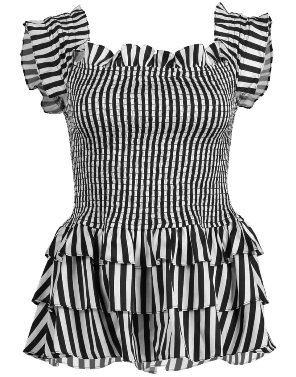 Caroline Constas Hydra top features a feminine off the shoulder neckline in a striped printed chiffon fabric. A smocked bodice and ruffled layers create a peplum silhouette.