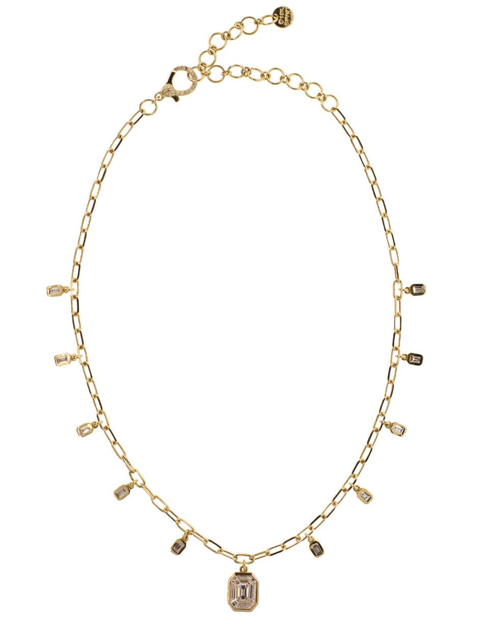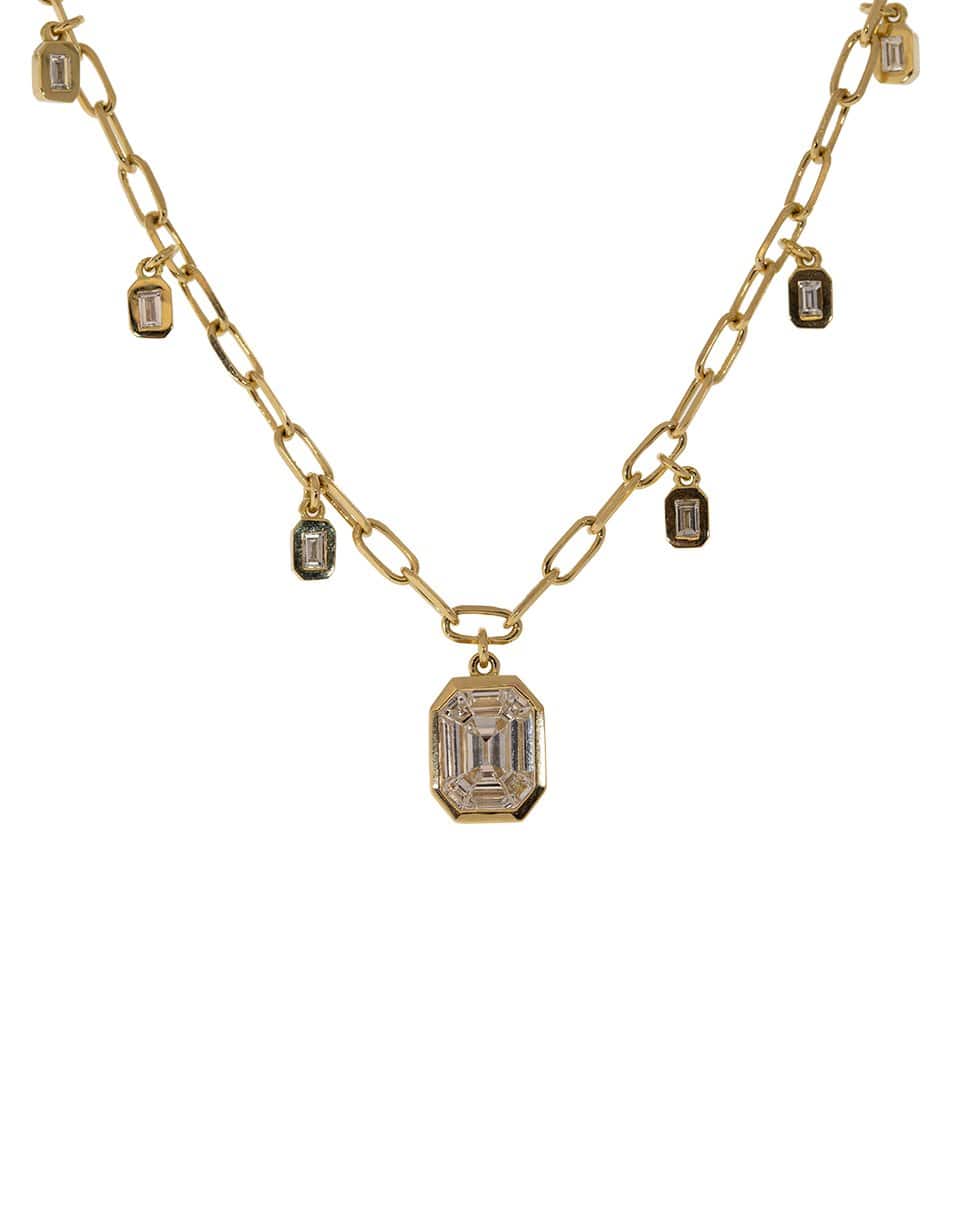 Illusion baguette diamond drop necklace set in 18k yellow gold.