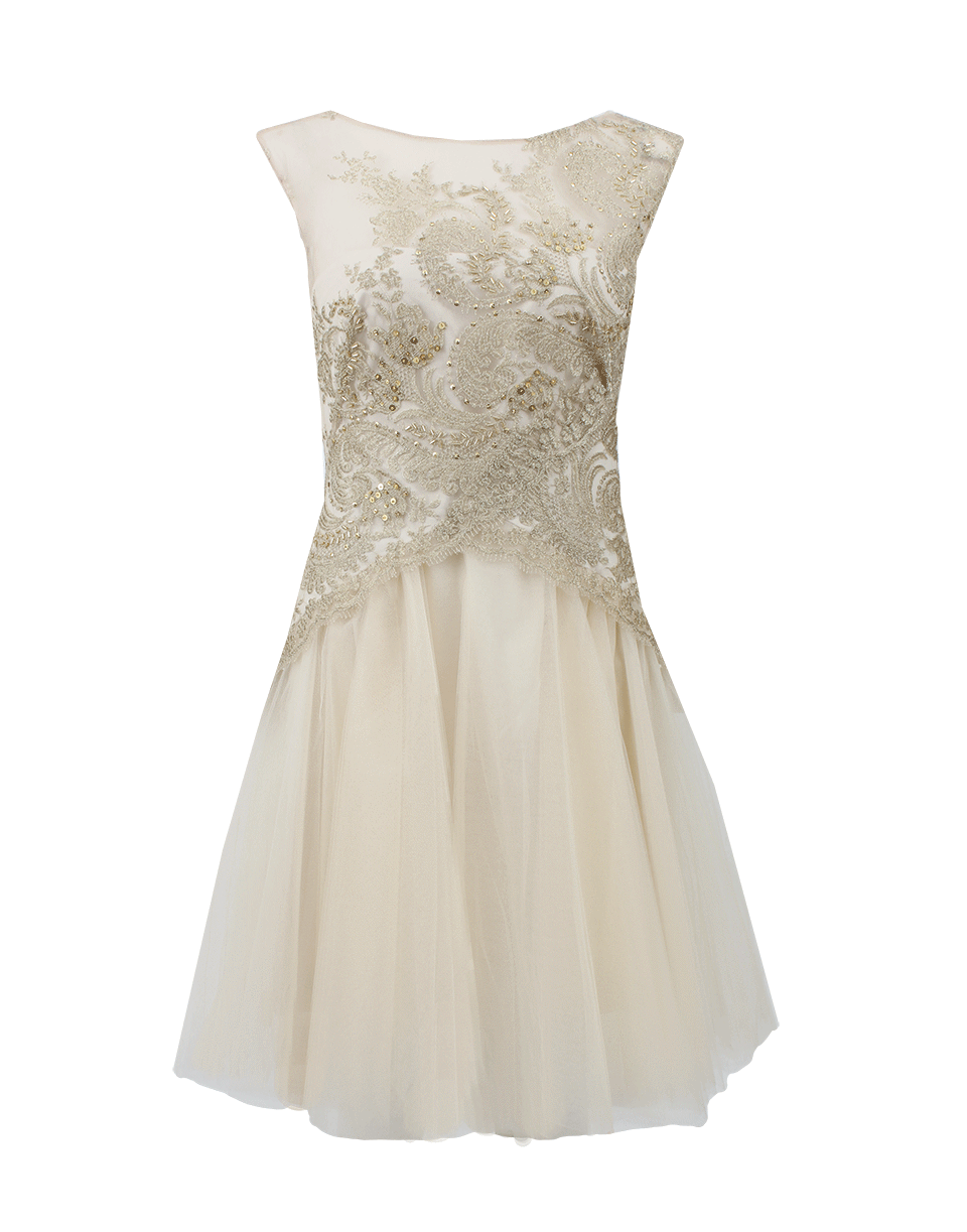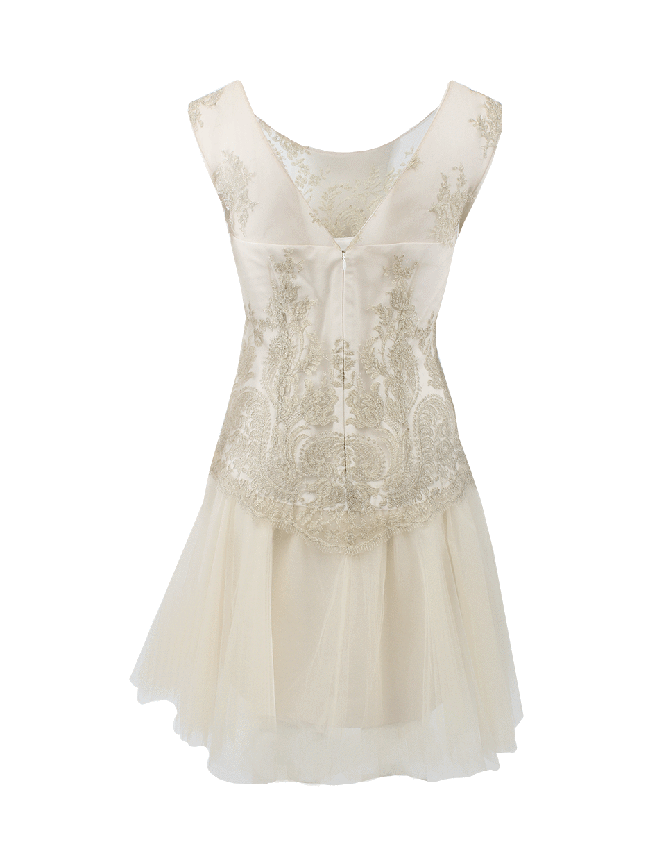High Neckline With V-Back And Sheer Underlay With Lace And Glass Bead Embroidery