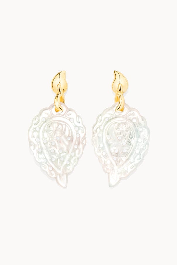 Tamara Comolli carved mother-of-pearl carved India leaf earrings.