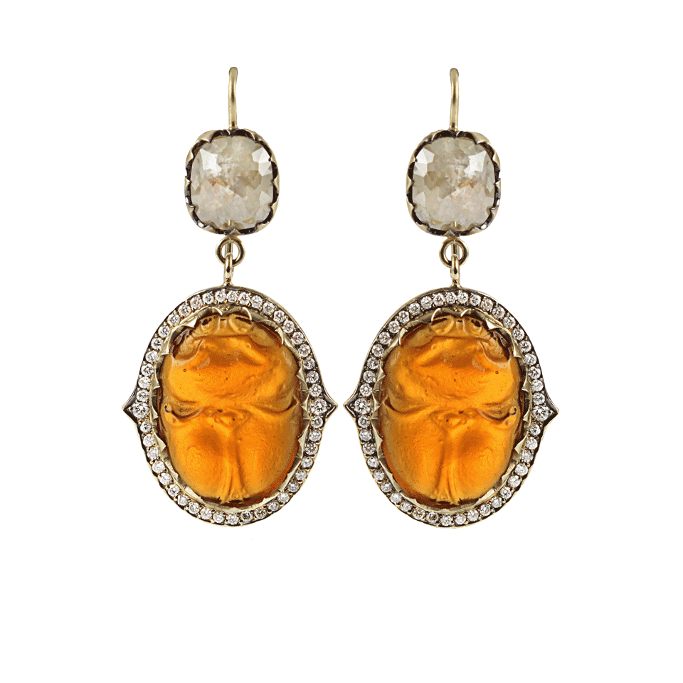 Glowing like a beaming summer sun, Sylva & Cie’s intaglio scarab diamond earrings are ravishing ornaments of sheer perfection.