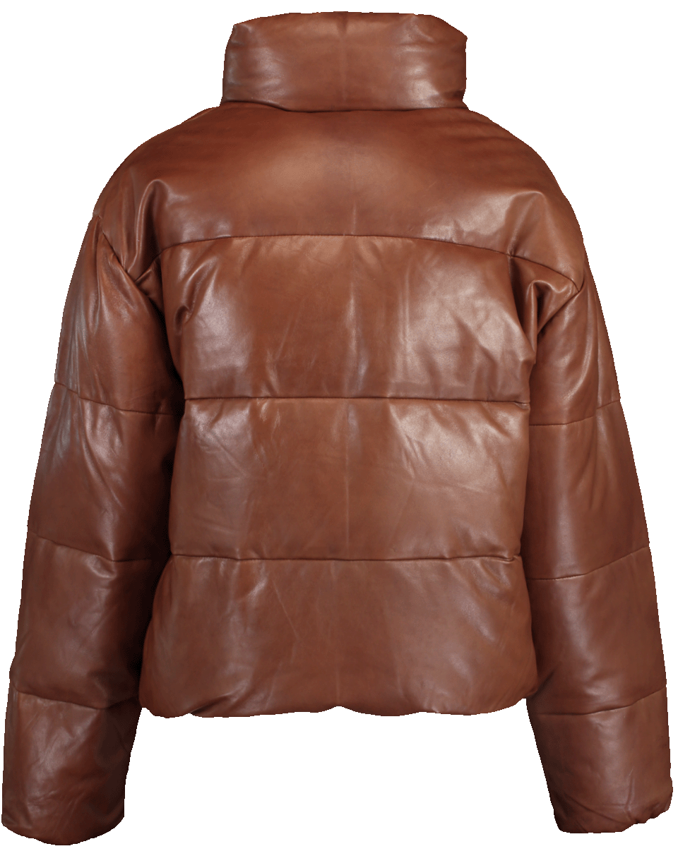 Leather puffer Iris jacket in cognac from LaMarque featuring a high neck, two-way exposed front zipper, side zip pockets, interior pocket, and a quilted design.