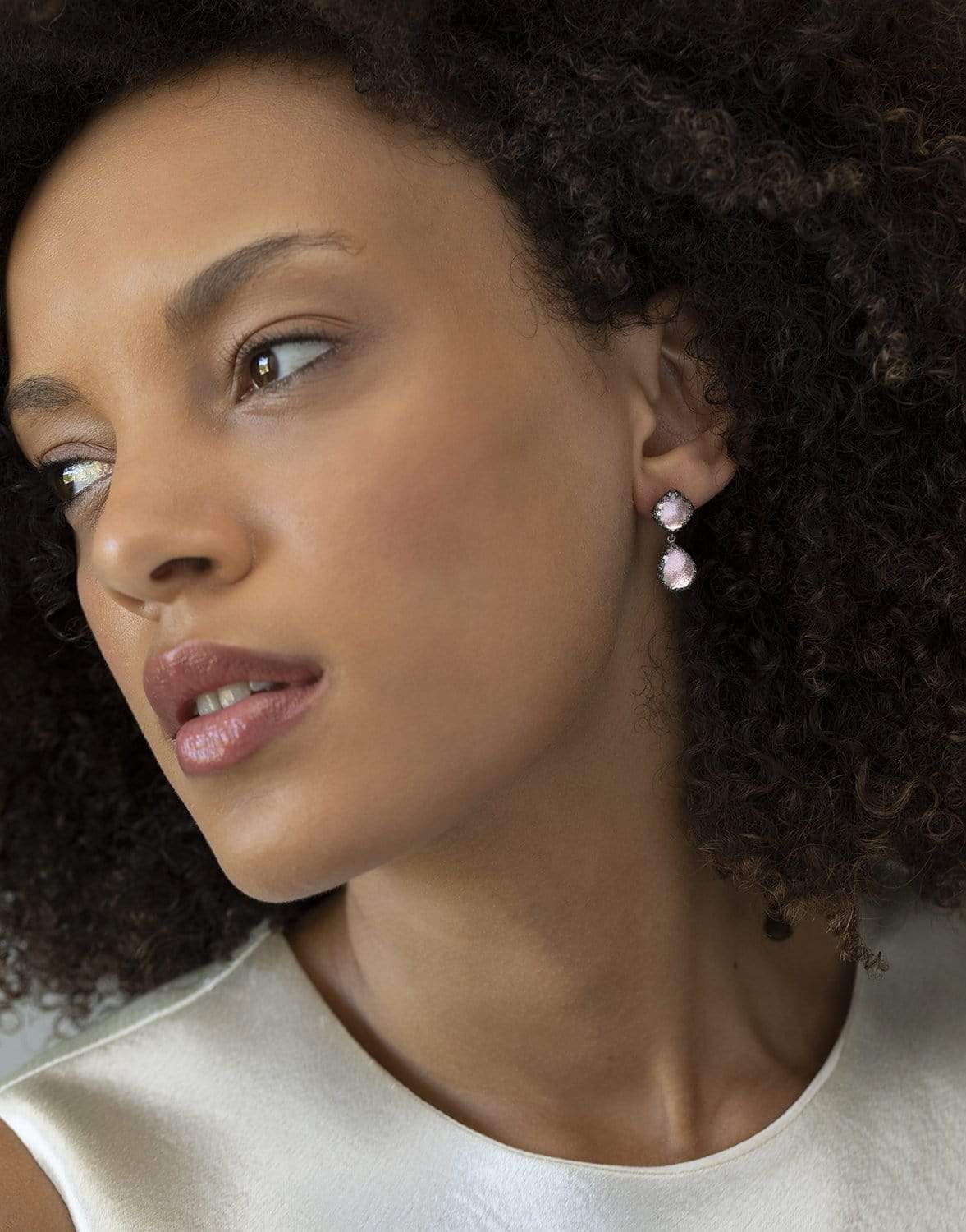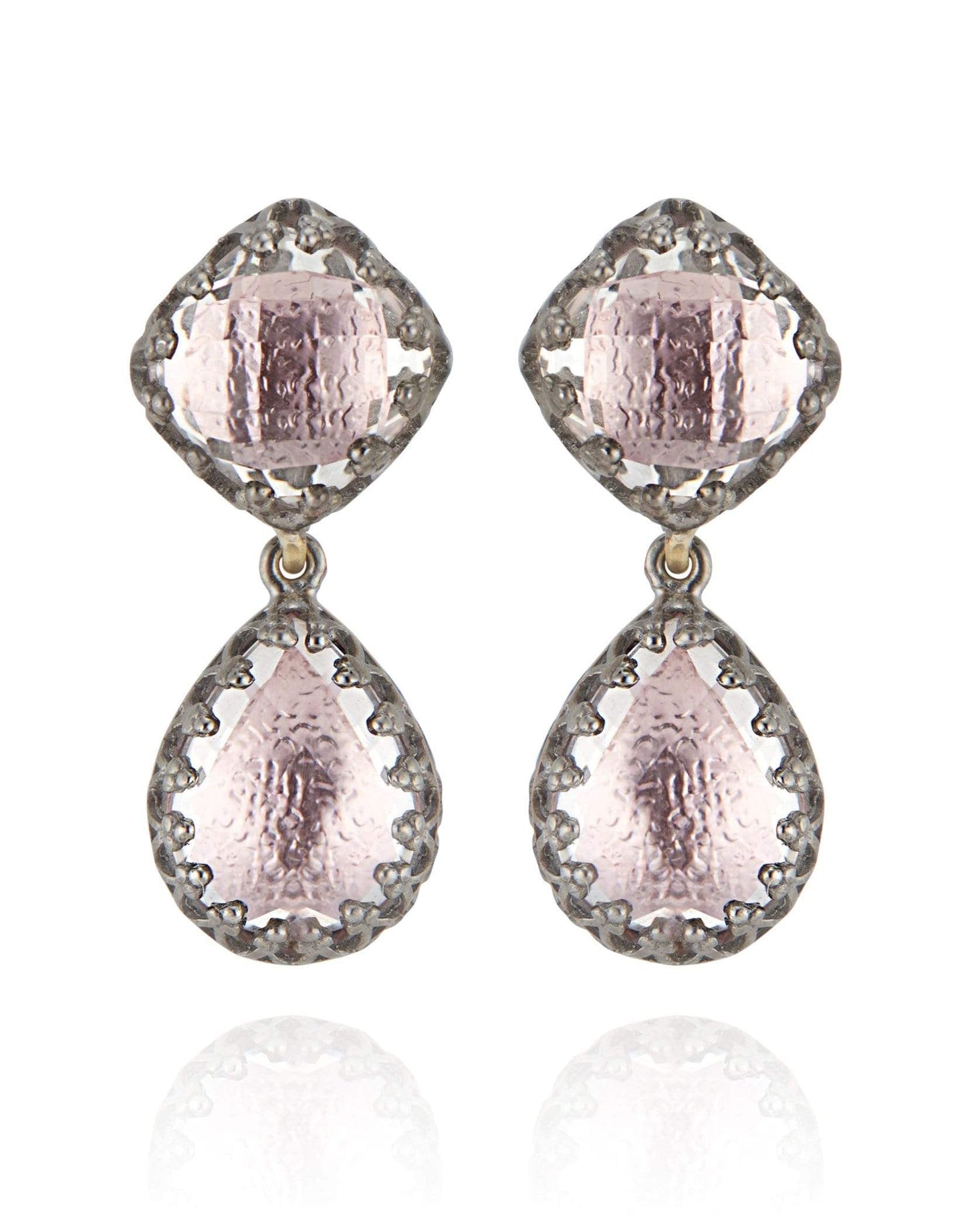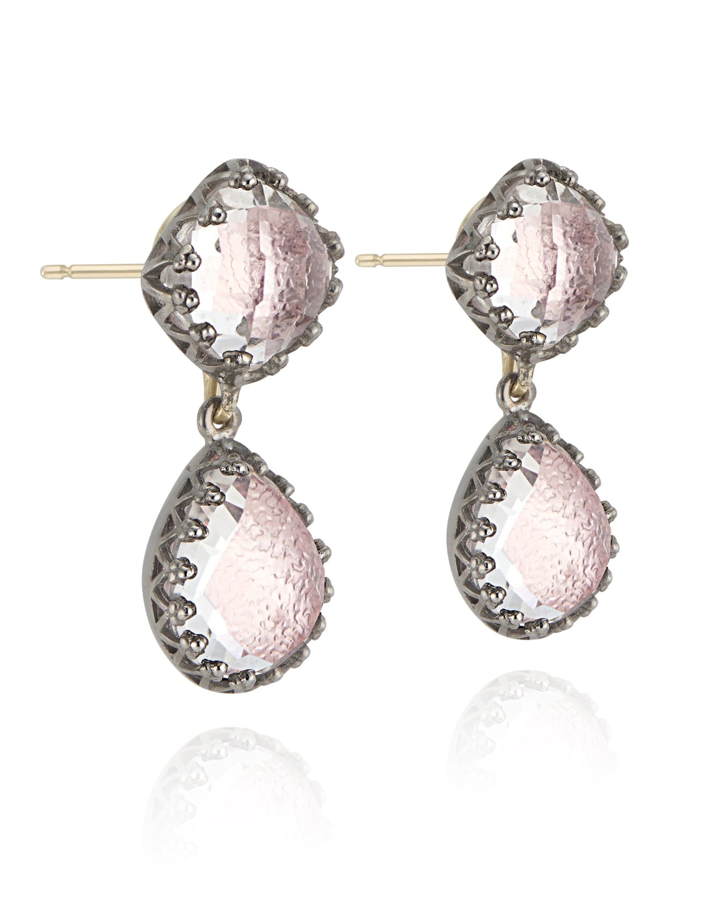 Black rhodium washed sterling silver, 14K posts, white quartz (8 ctw) with blush foil.