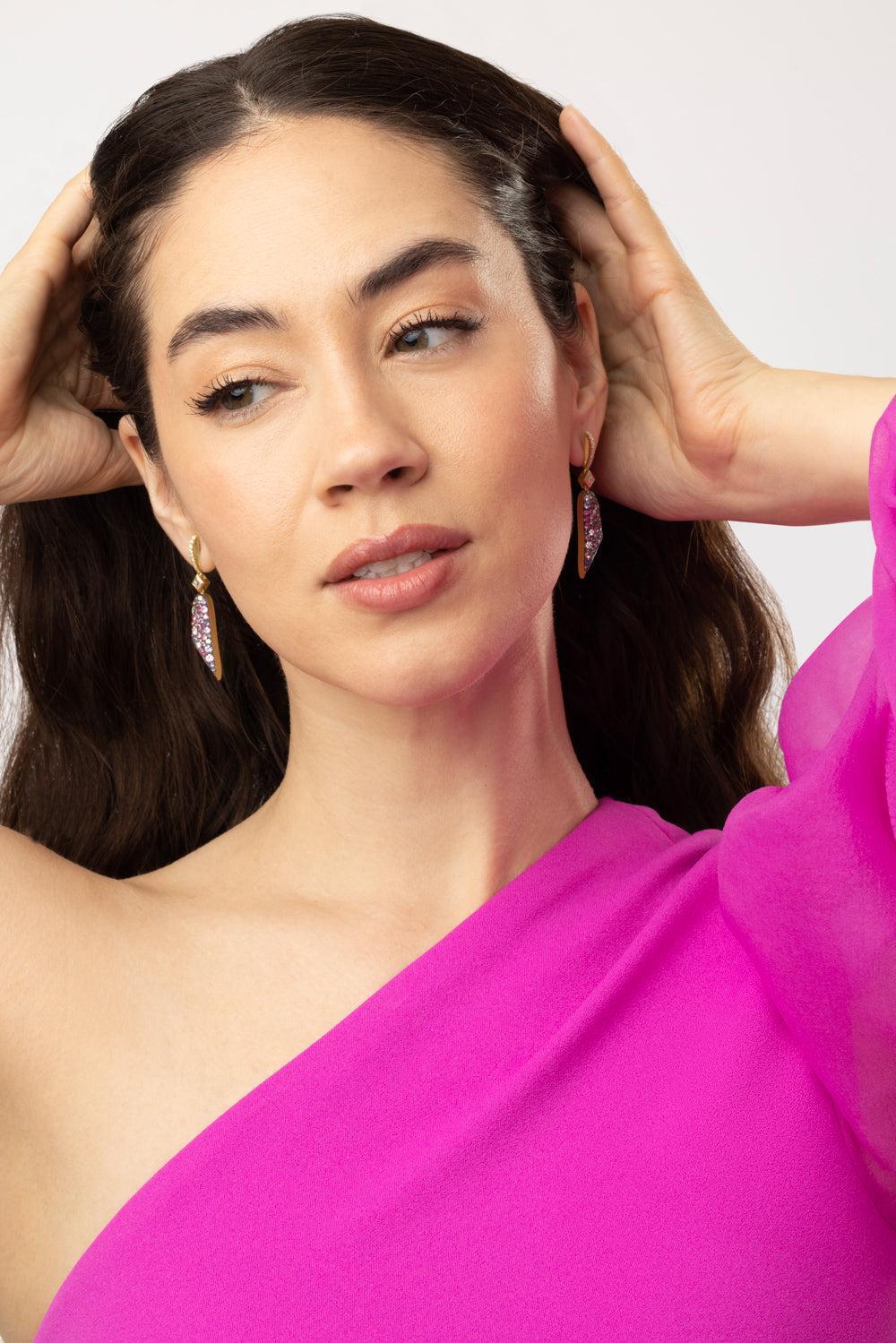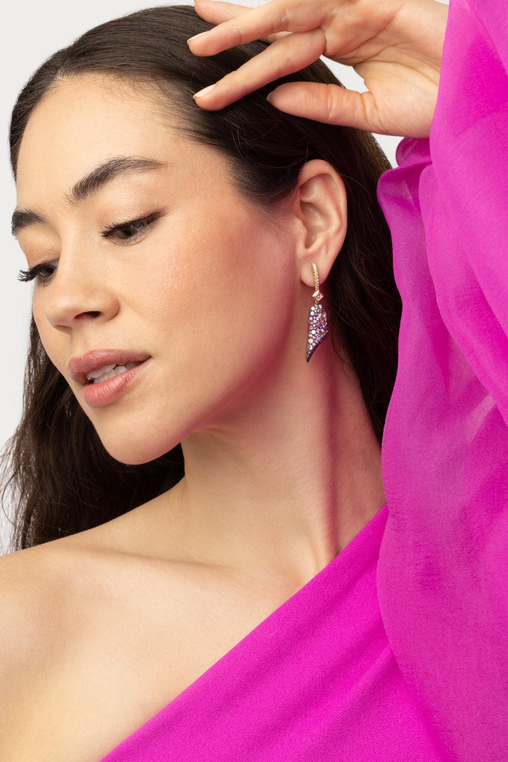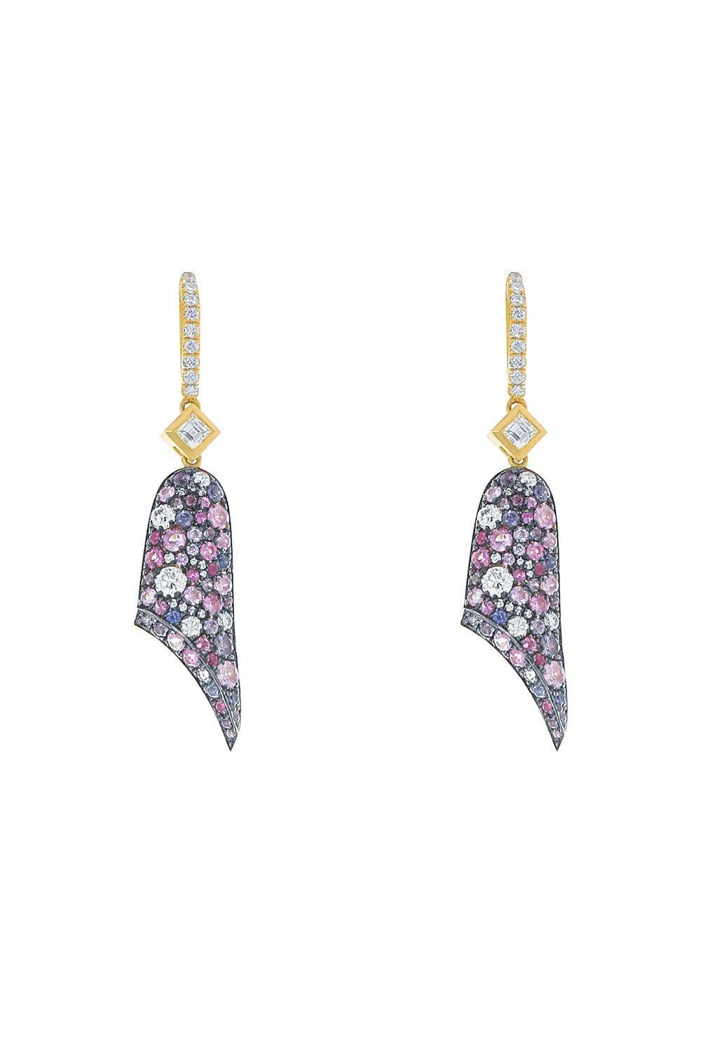Jared Lehr pink purple sapphire earrings in yellow gold.