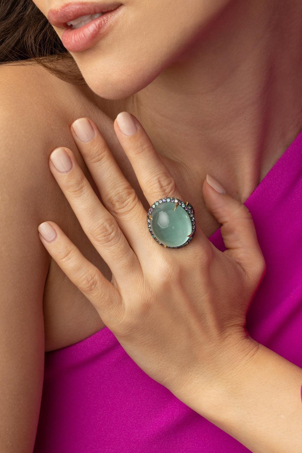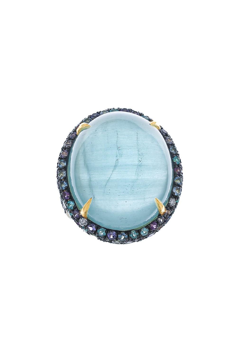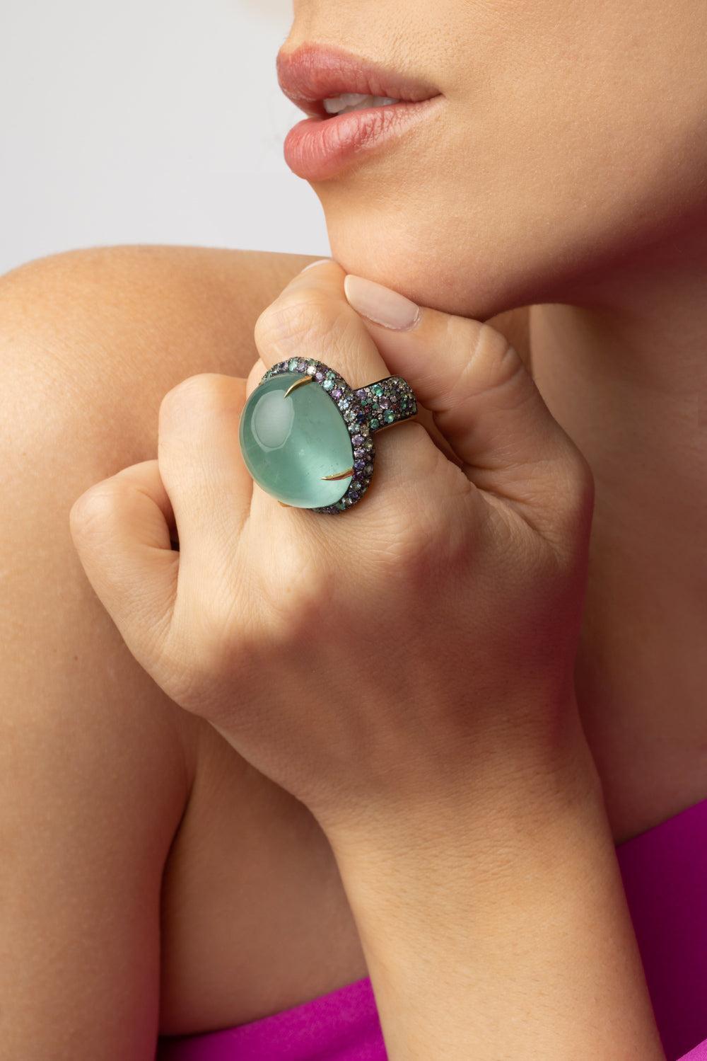 Jared Lehr purple sapphire, paraiba diamond ring in yellow gold.