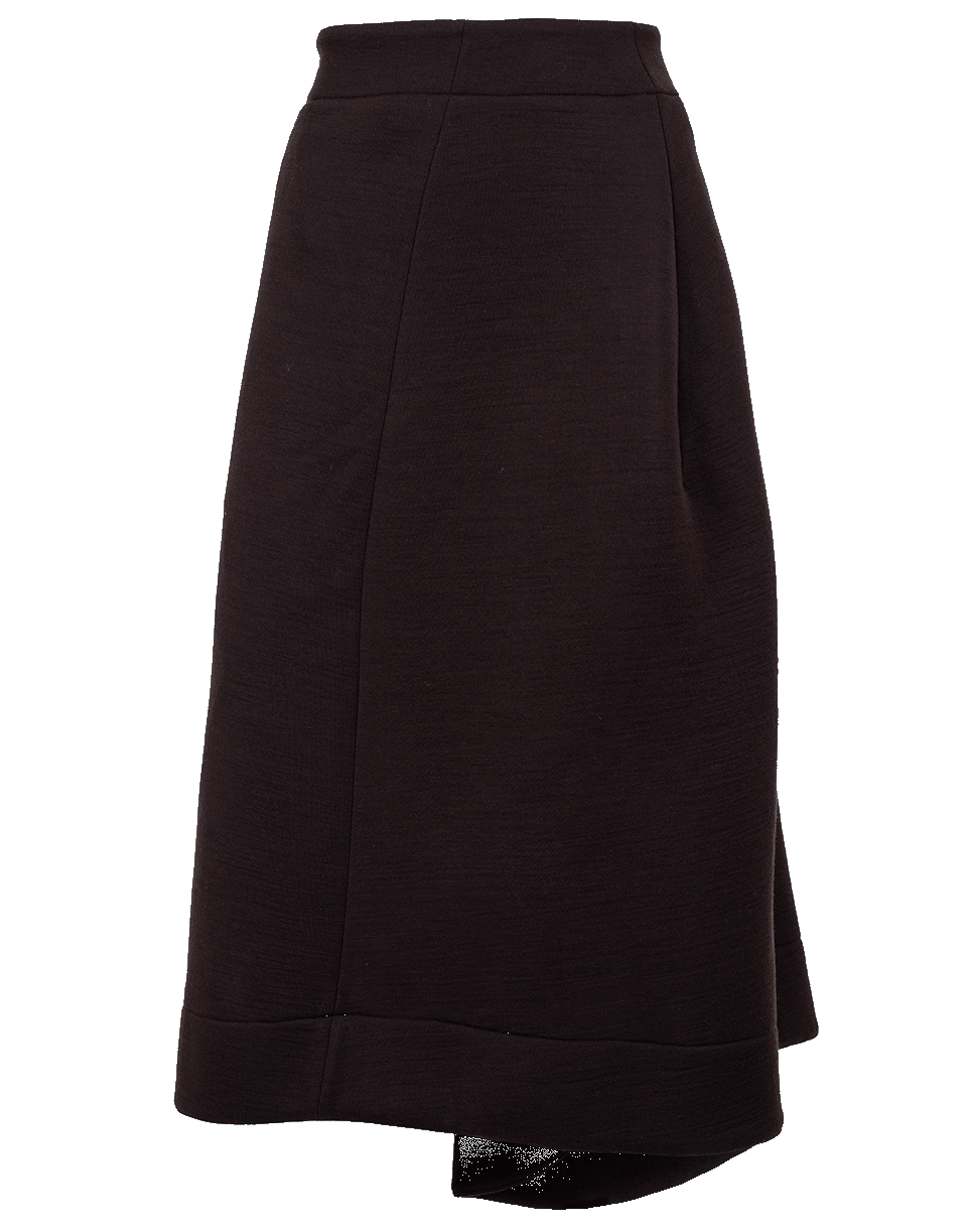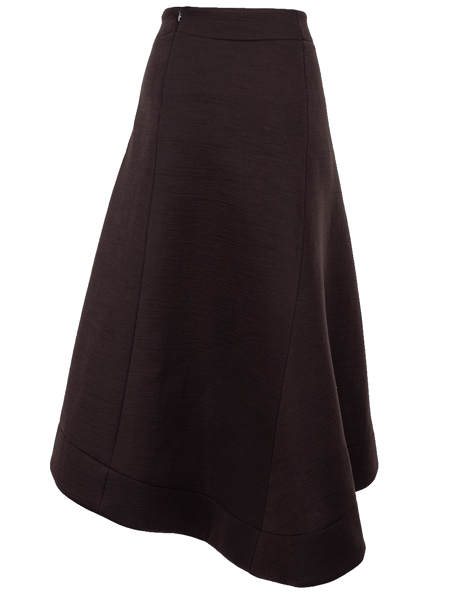 A-line calf length skirt from Jil Sander featuring a mid-rise waist, zip closure, side pockets, flared skirt, and asymmetric hem.