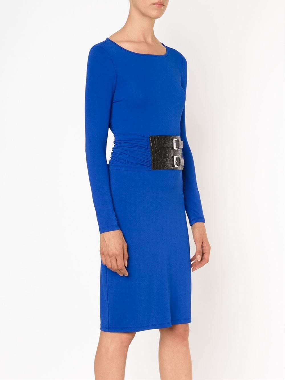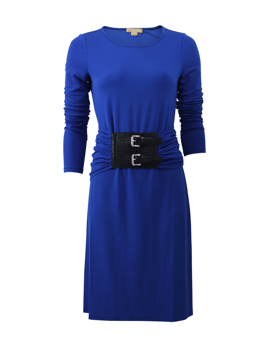 Matching Ruched Belt With Double Silver Buckle Closure And Faux Black Leather Detail