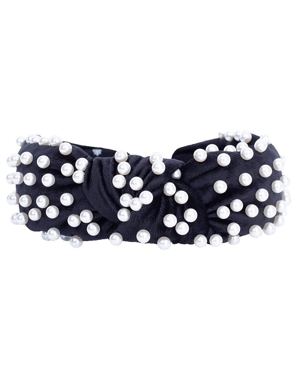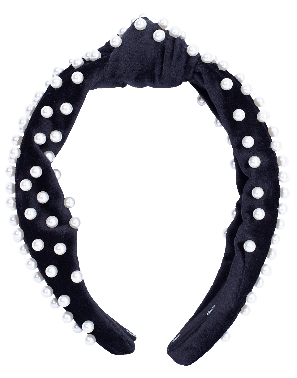 Lele Sadoughi designs velvet hand knotted handband with acrylic ivory pearl embellishments.