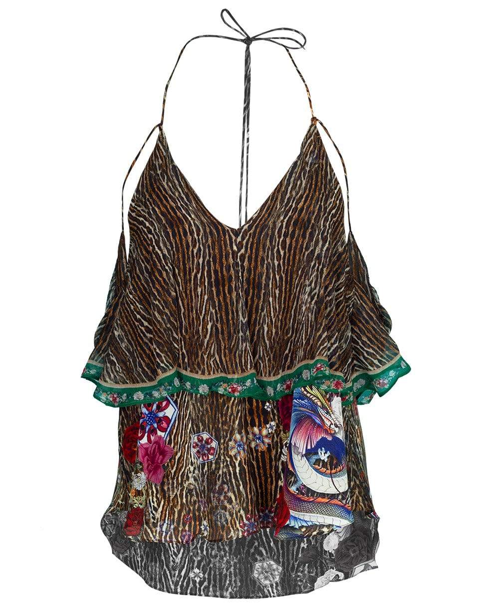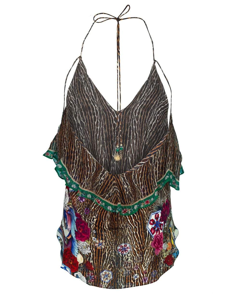 Camilla Jewel of Jupiter neckline frill top with leopard print, crystal embellishment, V-neck, dainty crossed straps at back, and a loose flared hem.