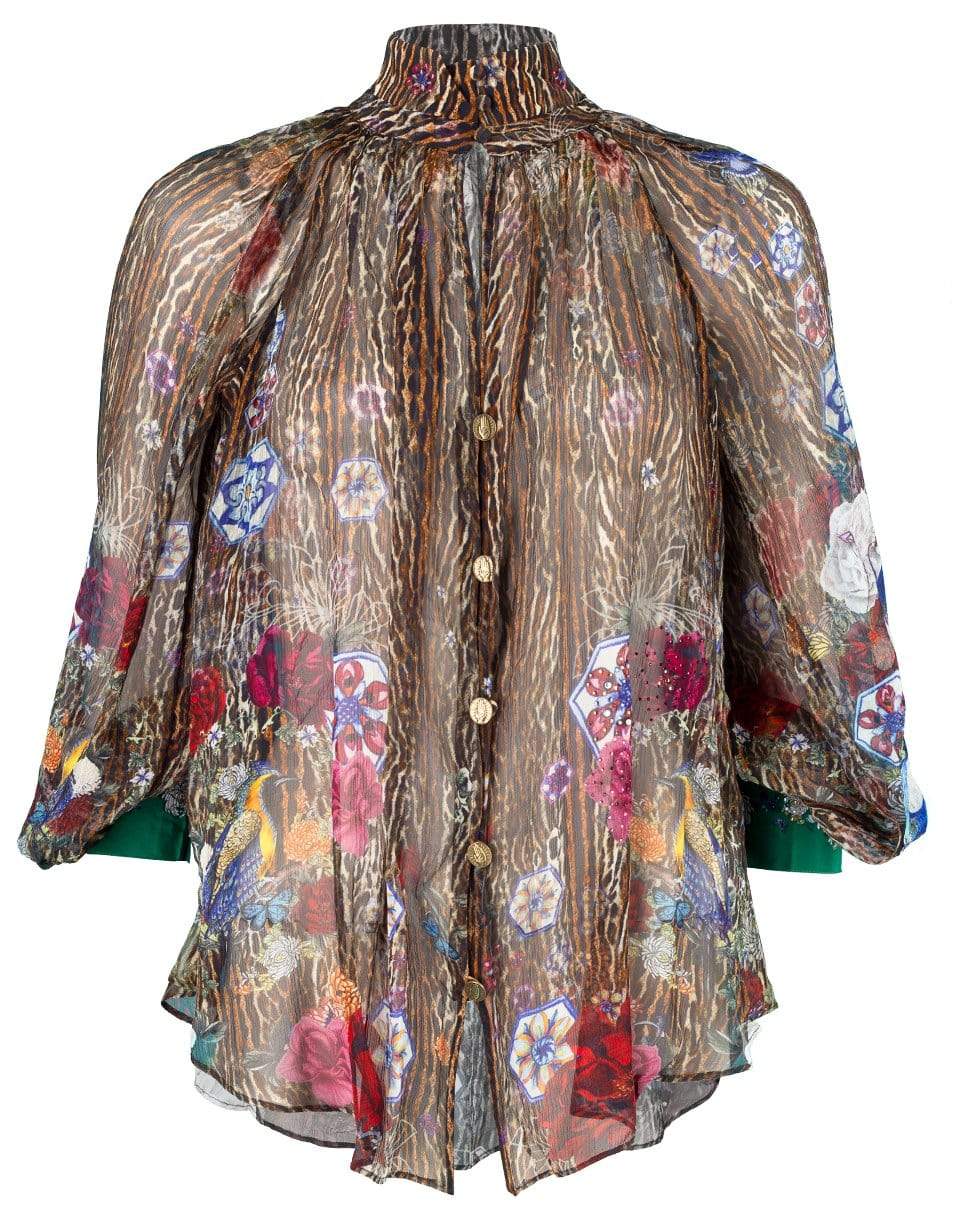 Camilla Jewel of Jupiter raglan button up shirt with a leopard print, blouson sleeves, button cuffs, front buttons, crystal embellishment, and a high neck collar.