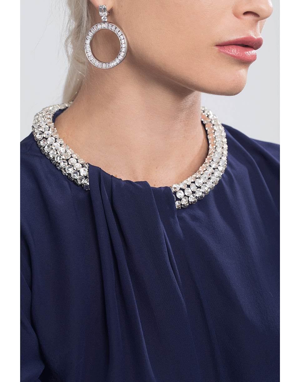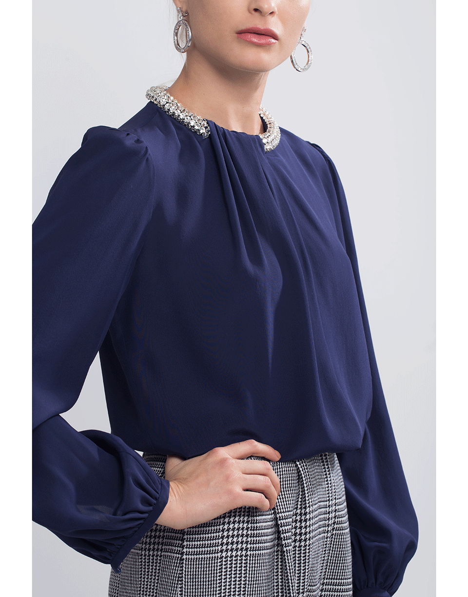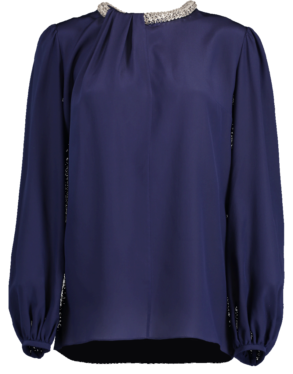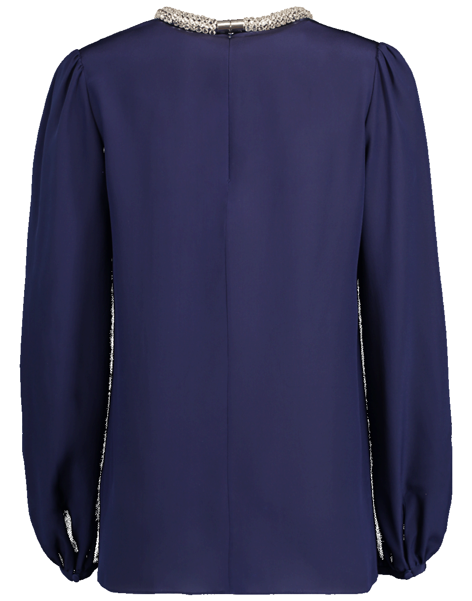 Sapphire blouse from Alexander McQueen featuring a relaxed fit with a round jeweled neckline, long balloon sleeves, a straight hem and a concealed back zip closure.